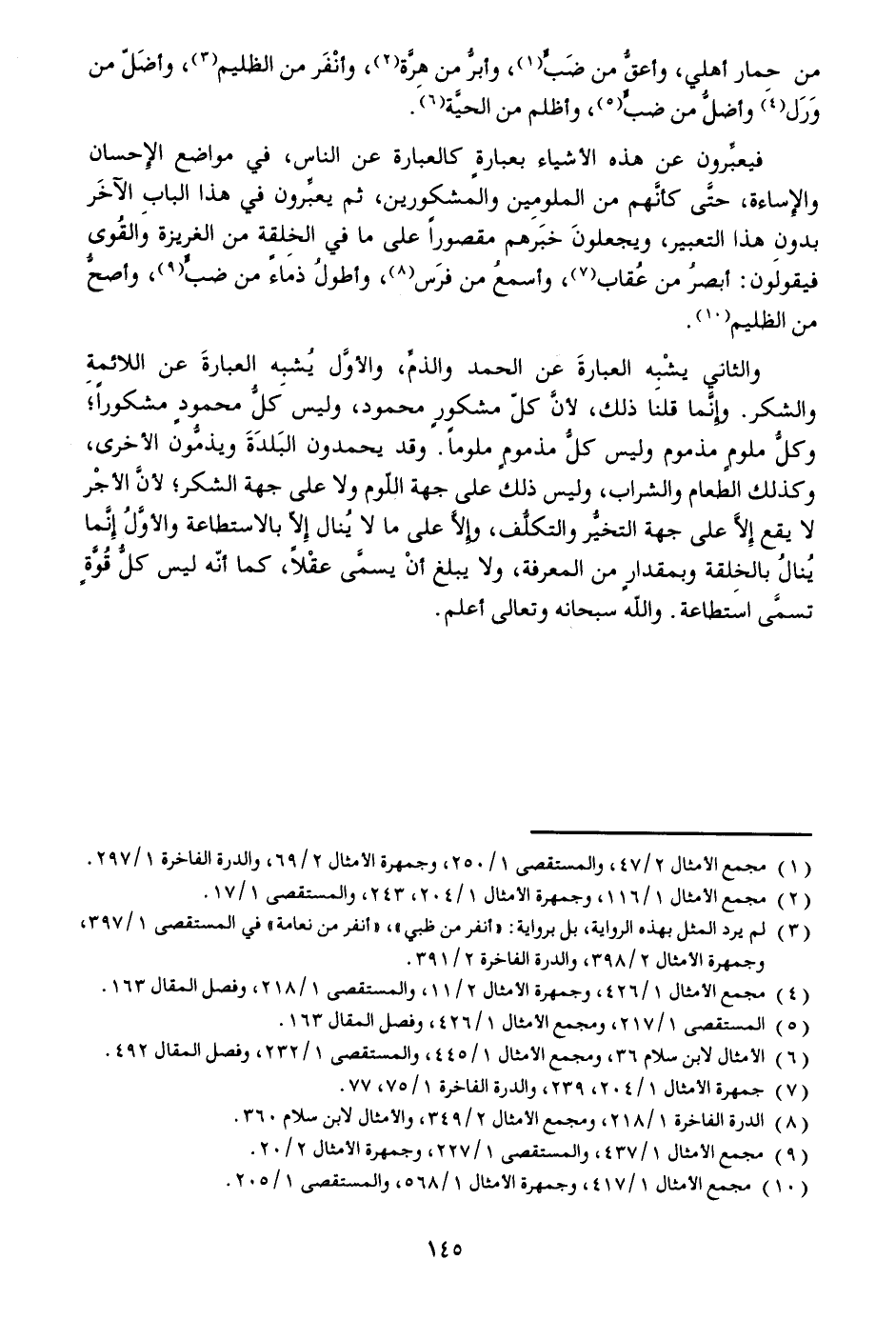 والثاني يشبه العبارة عن الحمد والذمّ، والأوّل يشبه العبارة عن اللائمة والشكر. وإنّما قلنا ذلك، لأنّ كلّ مشكور محمود، وليس كلّ محمود مشكورا؛ وكلّ ملوم مذموم وليس كلّ مذموم ملوما. وقد يحمدون البلدة ويذمّون الأخرى، وكذلك الطعام والشراب، وليس ذلك على جهة اللّوم ولا على جهة الشكر؛ لأنّ الأجر لا يقع إلّا على جهة التخيّر والتكلّف، وإلّا على ما لا ينال إلّا بالاستطاعة والأوّل إنّما ينال بالخلقة وبمقدار من المعرفة، ولا يبلغ أن يسمّى عقلا، كما أنّه ليس كلّ قوّة تسمّى استطاعة. والله سبحانه وتعالى أعلم.