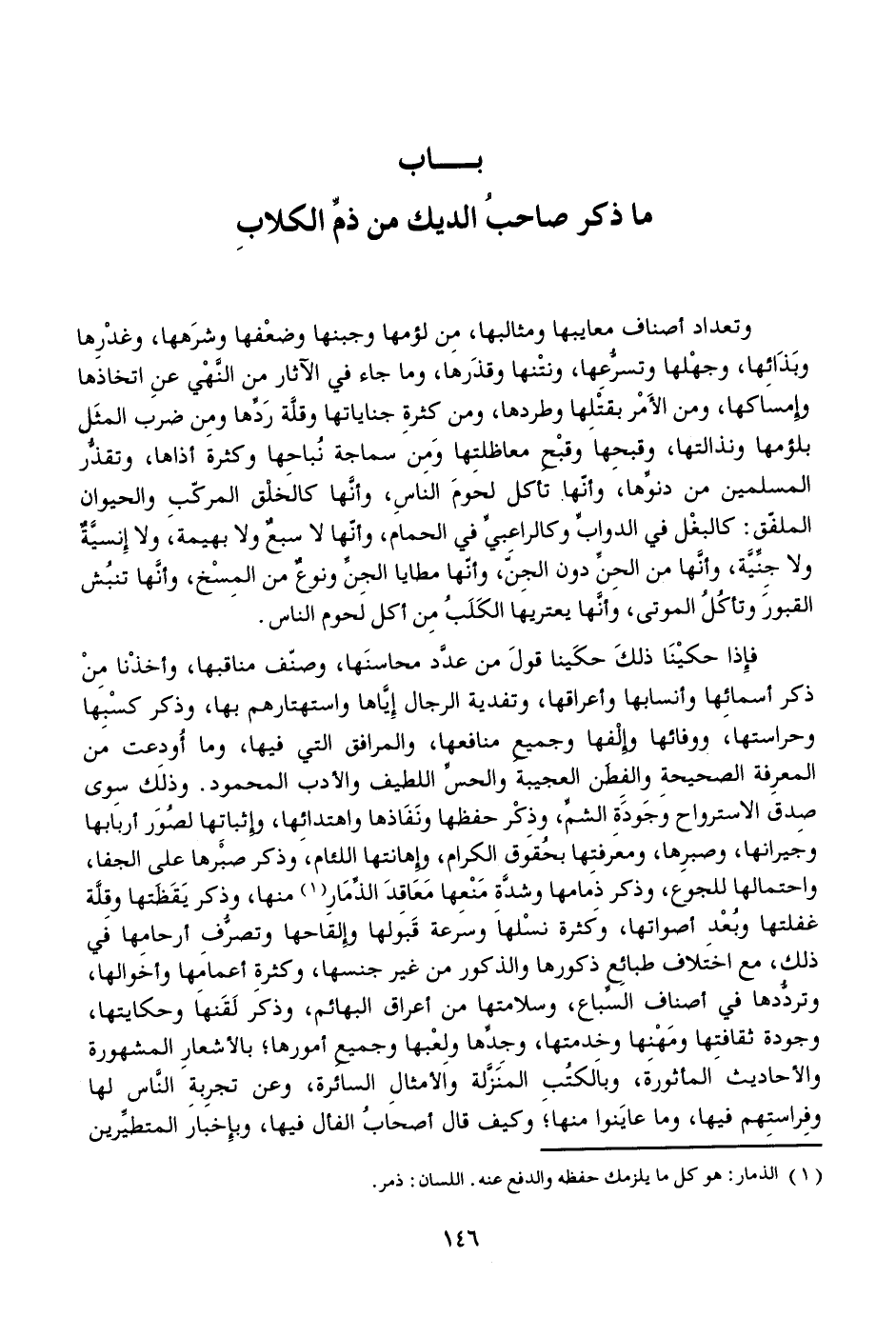 فإذا حكينا ذلك حكينا قول من عدّد محاسنها، وصنّف مناقبها، وأخذنا من ذكر أسمائها وأنسابها وأعراقها، وتفدية الرجال إيّاها واستهتارهم بها، وذكر كسبها وحراستها، ووفائها وإلفها وجميع منافعها، والمرافق التي فيها، وما أودعت من المعرفة الصحيحة والفطن العجيبة والحسّ اللطيف والأدب المحمود. وذلك سوى صدق الاسترواح وجودة الشمّ، وذكر حفظها ونفاذها واهتدائها، وإثباتها لصور أربابها وجيرانها، وصبرها، ومعرفتها بحقوق الكرام، وإهانتها اللئام، وذكر صبرها على الجفا، واحتمالها للجوع، وذكر ذمامها وشدّة منعها معاقد الذّمار «1» منها، وذكر يقظتها وقلّة غفلتها وبعد أصواتها، وكثرة نسلها وسرعة قبولها وإلقاحها وتصرّف أرحامها في ذلك، مع اختلاف طبائع ذكورها والذكور من غير جنسها، وكثرة أعمامها وأخوالها، وتردّدها في أصناف السّباع، وسلامتها من أعراق البهائم، وذكر لقنها وحكايتها، وجودة ثقافتها ومهنها وخدمتها، وجدّها ولعبها وجميع أمورها؛ بالأشعار المشهورة والأحاديث المأثورة، وبالكتب المنزّلة والأمثال السائرة، وعن تجربة النّاس لها وفراستهم فيها، وما عاينوا منها؛ وكيف قال أصحاب الفأل فيها، وبإخبار المتطيّرين