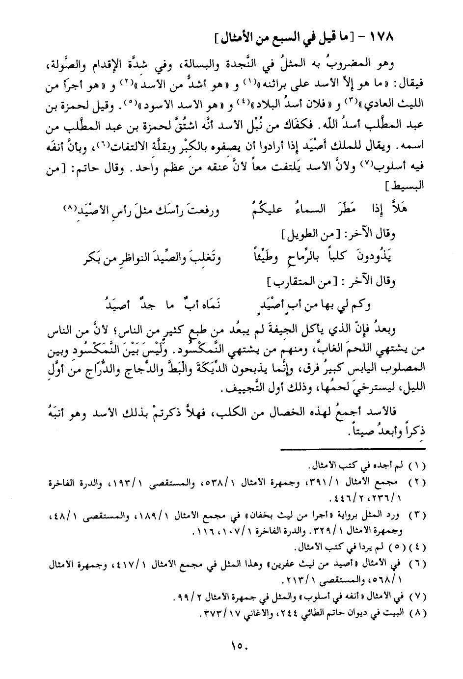 وهو المضروب به المثل في النّجدة والبسالة، وفي شدّة الإقدام والصّولة، فيقال: «ما هو إلّا الأسد على براثنه» «1» و «هو أشدّ من الأسد» «2» و «هو أجرا من الليث العادي» «3» و «فلان أسد البلاد» «4» و «هو الأسد الأسود» «5» . وقيل لحمزة بن عبد المطّلب أسد الله. فكفاك من نبل الأسد أنّه اشتقّ لحمزة بن عبد المطّلب من اسمه. ويقال للملك أصيد إذا أرادوا أن يصفوه بالكبر وبقلّة الالتفات «6» ، وبأنّ أنفه فيه أسلوب «7» ولأنّ الأسد يلتفت معا لأنّ عنقه من عظم واحد. وقال حاتم: [من البسيط]