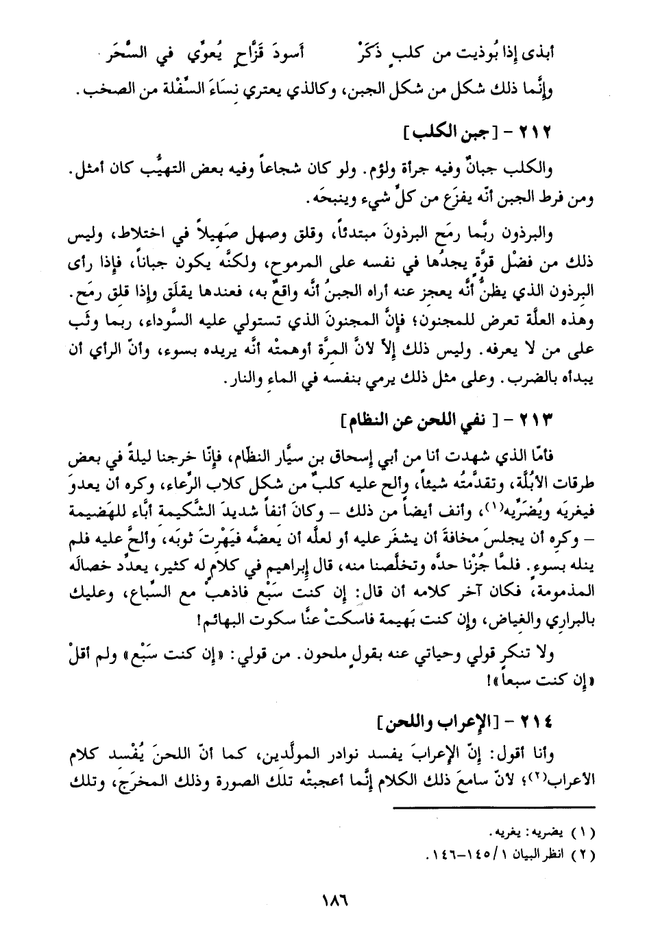 فأمّا الذي شهدت أنا من أبي إسحاق بن سيّار النظّام، فإنّا خرجنا ليلة في بعض طرقات الأبلّة، وتقدّمته شيئا، وألح عليه كلب من شكل كلاب الرّعاء، وكره أن يعدو فيغريه ويضرّيه «1» ، وأنف أيضا من ذلك- وكان أنفا شديد الشّكيمة أبّاء للهضيمة- وكره أن يجلس مخافة أن يشغر عليه أو لعلّه أن يعضّه فيهرت ثوبه، وألحّ عليه فلم ينله بسوء. فلمّا جزنا حدّه وتخلّصنا منه، قال إبراهيم في كلام له كثير، يعدّد خصاله المذمومة، فكان آخر كلامه أن قال: إن كنت سبع فاذهب مع السّباع، وعليك بالبراري والغياض، وإن كنت بهيمة فاسكت عنّا سكوت البهائم! ولا تنكر قولي وحياتي عنه بقول ملحون. من قولي: «إن كنت سبع» ولم أقل «إن كنت سبعا» !