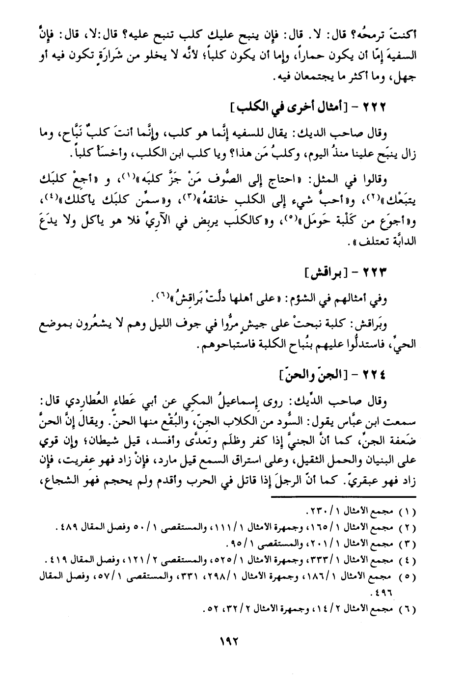 سمعت ابن عبّاس يقول: السّود من الكلاب الجنّ، والبقع منها الحنّ. ويقال إنّ الحنّ ضعفة الجنّ، كما أنّ الجنيّ إذا كفر وظلم وتعدّى وأفسد، قيل شيطان؛ وإن قوي على البنيان والحمل الثقيل، وعلى استراق السمع قيل مارد، فإن زاد فهو عفريت، فإن زاد فهو عبقريّ. كما أنّ الرجل إذا قاتل في الحرب وأقدم ولم يحجم فهو الشجاع،