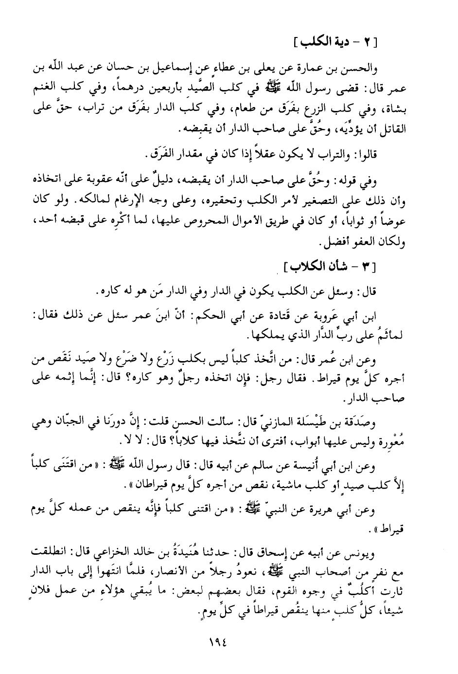 والحسن بن عمارة عن يعلى بن عطاء عن إسماعيل بن حسان عن عبد الله بن عمر قال: قضى رسول الله صلى الله عليه وسلم في كلب الصّيد بأربعين درهما، وفي كلب الغنم بشاة، وفي كلب الزرع بفرق من طعام، وفي كلب الدار بفرق من تراب، حقّ على القاتل أن يؤدّيه، وحقّ على صاحب الدار أن يقبضه.