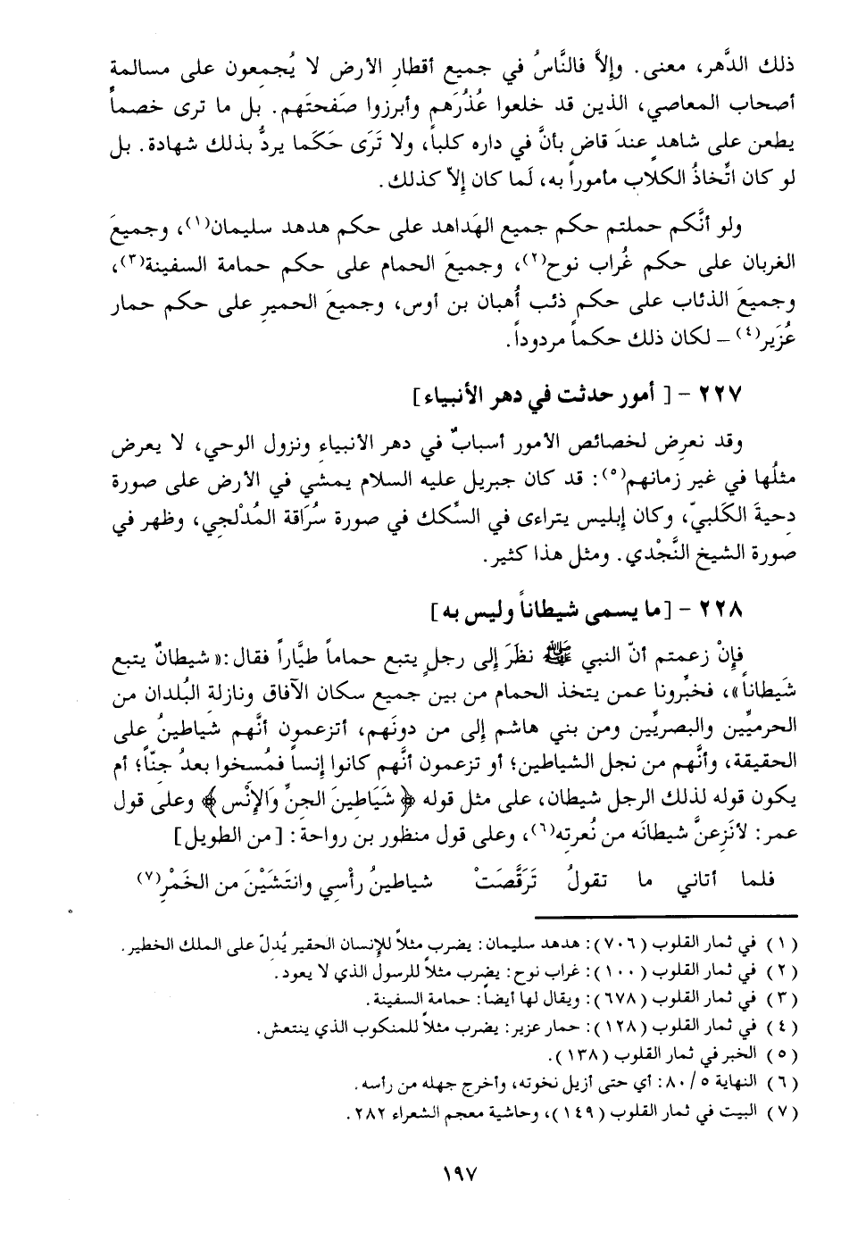 وقد نعرض لخصائص الأمور أسباب في دهر الأنبياء ونزول الوحي، لا يعرض مثلها في غير زمانهم «5» : قد كان جبريل عليه السلام يمشي في الأرض على صورة دحية الكلبيّ، وكان إبليس يتراءى في السّكك في صورة سراقة المدلجي، وظهر في صورة الشيخ النّجدي. ومثل هذا كثير.