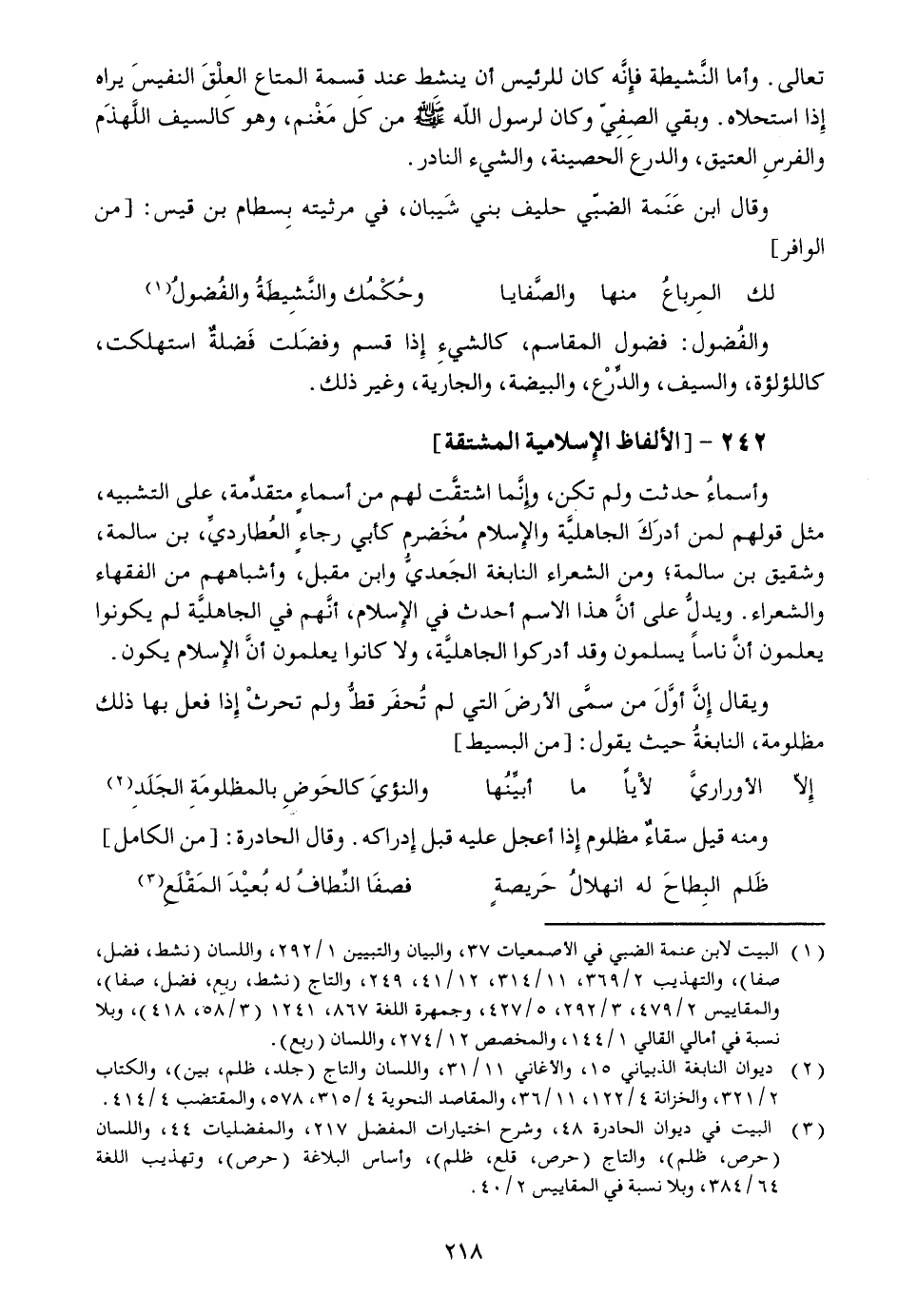 لك المرباع منها والصّفايا ... وحكمك والنّشيطة والفضول «1»