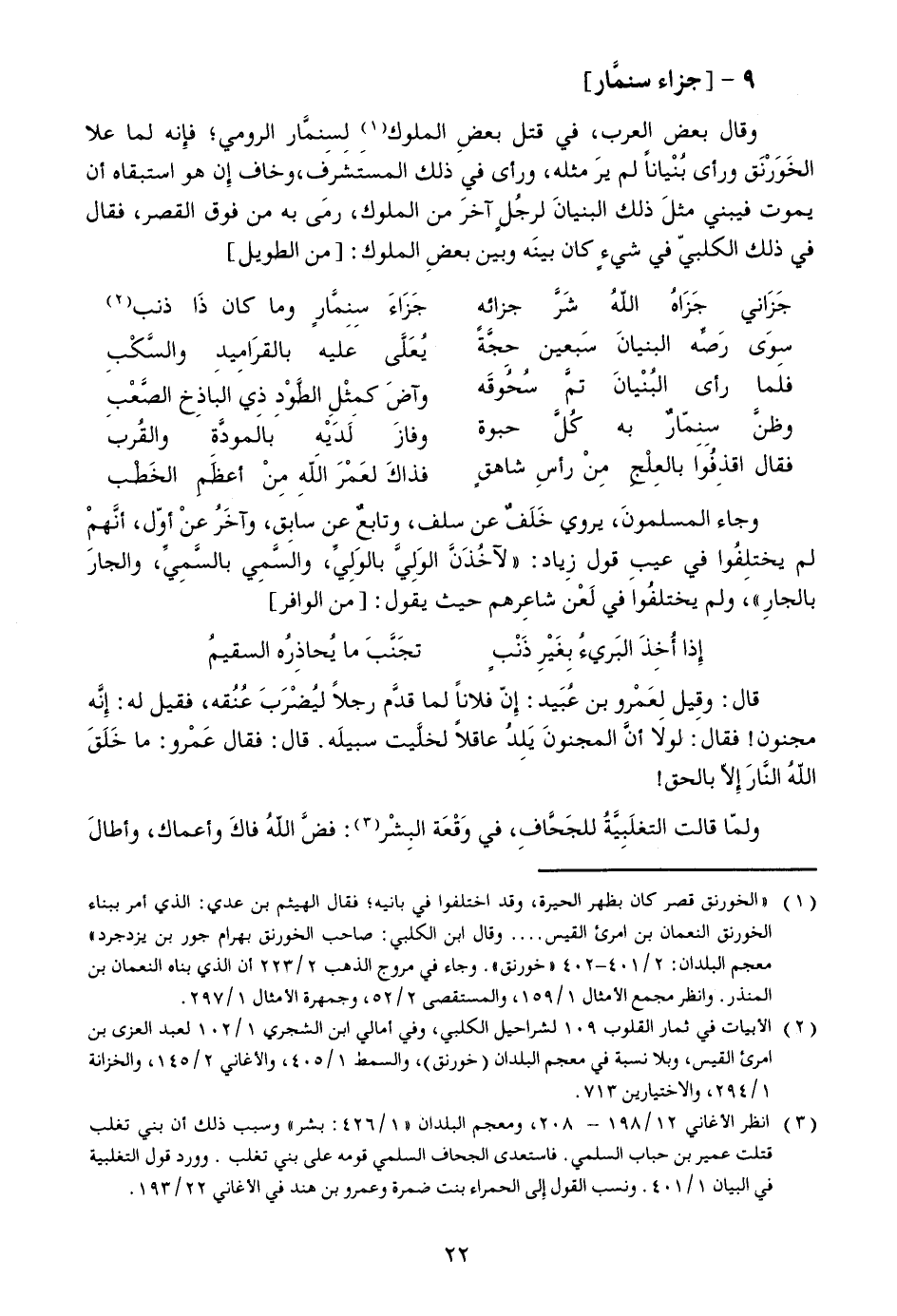 وقال بعض العرب، في قتل بعض الملوك «1» لسنمّار الرومي؛ فإنه لما علا الخورنق ورأى بنيانا لم ير مثله، ورأى في ذلك المستشرف، وخاف إن هو استبقاه أن يموت فيبني مثل ذلك البنيان لرجل آخر من الملوك، رمى به من فوق القصر، فقال في ذلك الكلبيّ في شيء كان بينه وبين بعض الملوك: [من الطويل]