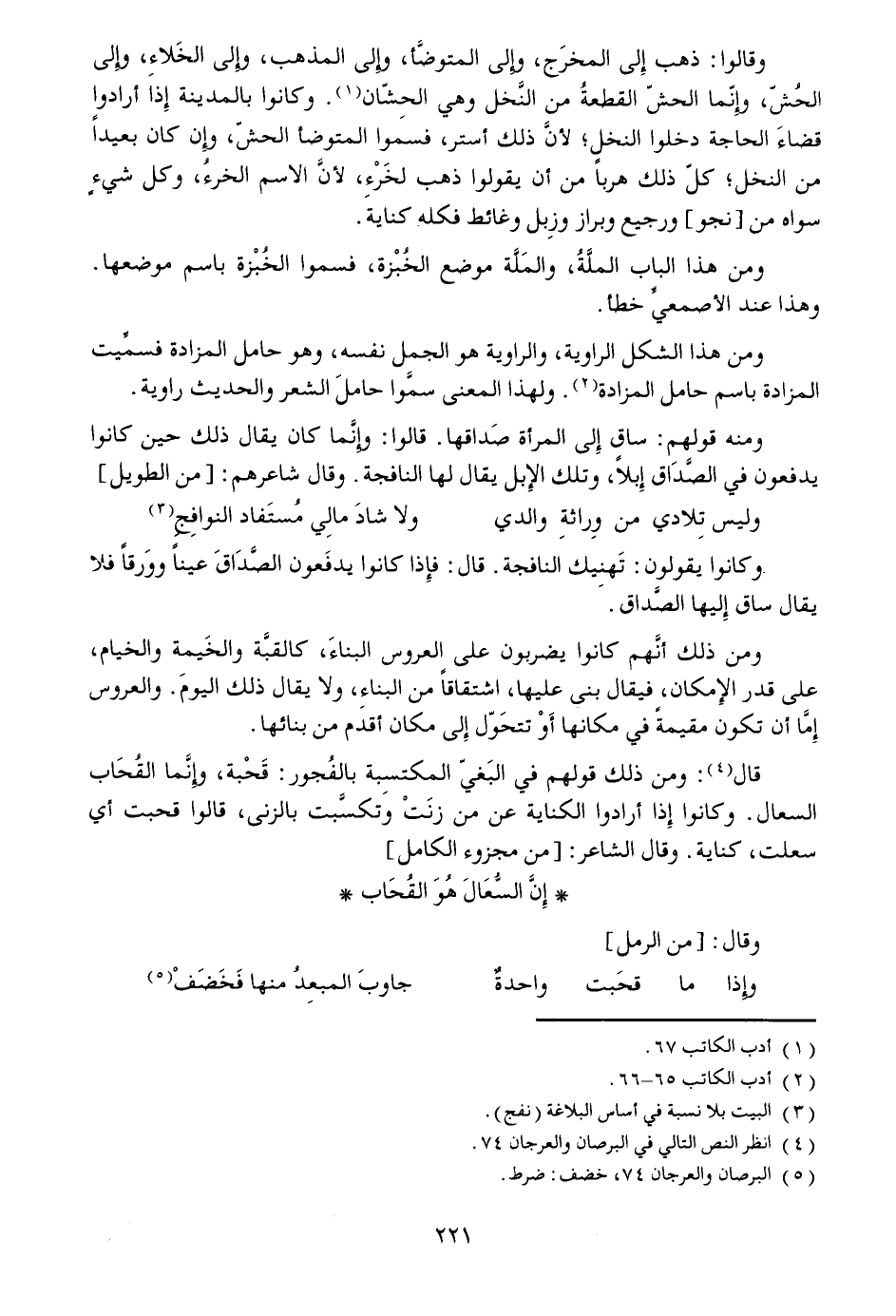 وقالوا: ذهب إلى المخرج، وإلى المتوضّأ، وإلى المذهب، وإلى الخلاء، وإلى الحشّ، وإنّما الحشّ القطعة من النّخل وهي الحشّان «1» . وكانوا بالمدينة إذا أرادوا قضاء الحاجة دخلوا النخل؛ لأنّ ذلك أستر، فسموا المتوضأ الحشّ، وإن كان بعيدا من النخل؛ كلّ ذلك هربا من أن يقولوا ذهب لخرء، لأنّ الاسم الخرء، وكل شيء سواه من [نجو] ورجيع وبراز وزبل وغائط فكله كناية.
