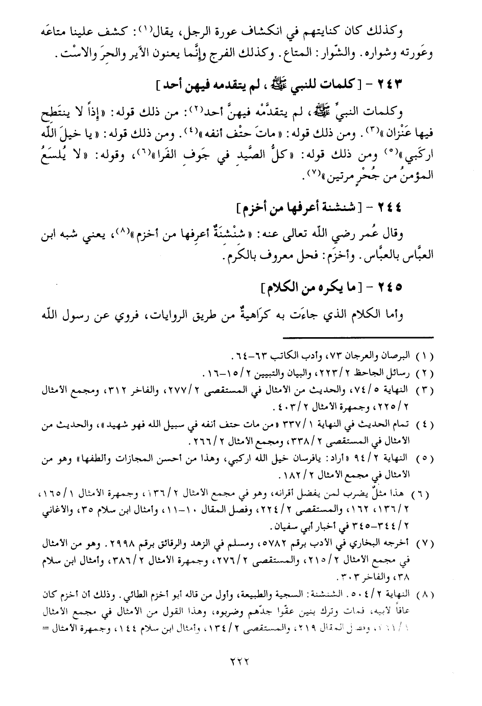 وكلمات النبيّ صلى الله عليه وسلم، لم يتقدّمه فيهنّ أحد «2» : من ذلك قوله: «إذا لا ينتطح فيها عنزان» «3» . ومن ذلك قوله: «مات حتف أنفه» «4» . ومن ذلك قوله: «يا خيل الله اركبي» «5» ومن ذلك قوله: «كلّ الصّيد في جوف الفرا» «6» ، وقوله: «لا يلسع المؤمن من جحر مرتين» «7» .