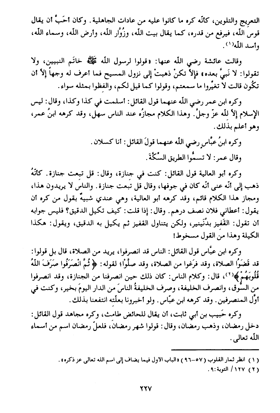 وكره أبو العالية قول القائل: كنت في جنازة، وقال: قل تبعت جنازة. كأنّه ذهب إلى أنّه عنى أنّه كان في جوفها، وقال قل تبعت جنازة. والناس لا يريدون هذا، ومجاز هذا الكلام قائم، وقد كرهه أبو العالية، وهي عندي شبيه بقول من كره أن يقول: أعطاني فلان نصف درهم. وقال: إذا قلت: كيف تكيل الدقيق؟ فليس جوابه أن تقول: القفيز بدنينير، ولكن يتناول القفيز ثم يكيل به الدقيق، ويقول: هكذا الكيلة وهذا من القول مسخوط! وكره ابن عبّاس قول القائل: الناس قد انصرفوا، يريد من الصلاة، قال بل قولوا: