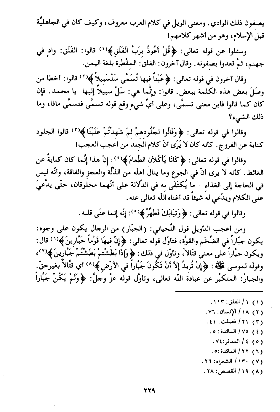 يصفون ذلك الوادي. ومعنى الويل في كلام العرب معروف، وكيف كان في الجاهليّة قبل الإسلام، وهو من أشهر كلامهم! وسئلوا عن قوله تعالى: قُلْ أَعُوذُ بِرَبِّ الْفَلَقِ