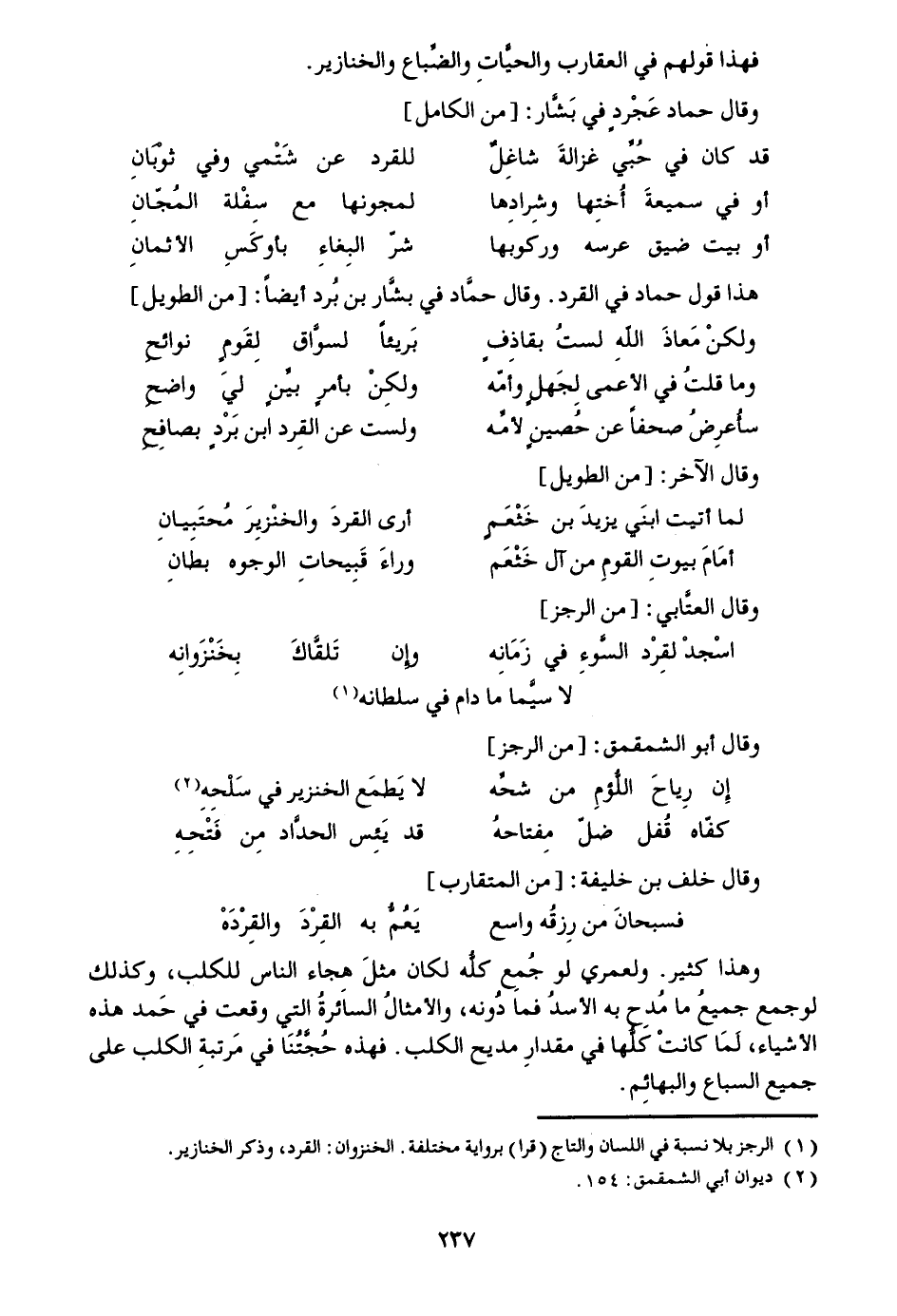 وهذا كثير. ولعمري لو جمع كلّه لكان مثل هجاء الناس للكلب، وكذلك لو جمع جميع ما مدح به الأسد فما دونه، والأمثال السائرة التي وقعت في حمد هذه الأشياء، لما كانت كلّها في مقدار مديح الكلب. فهذه حجّتنا في مرتبة الكلب على جميع السباع والبهائم.