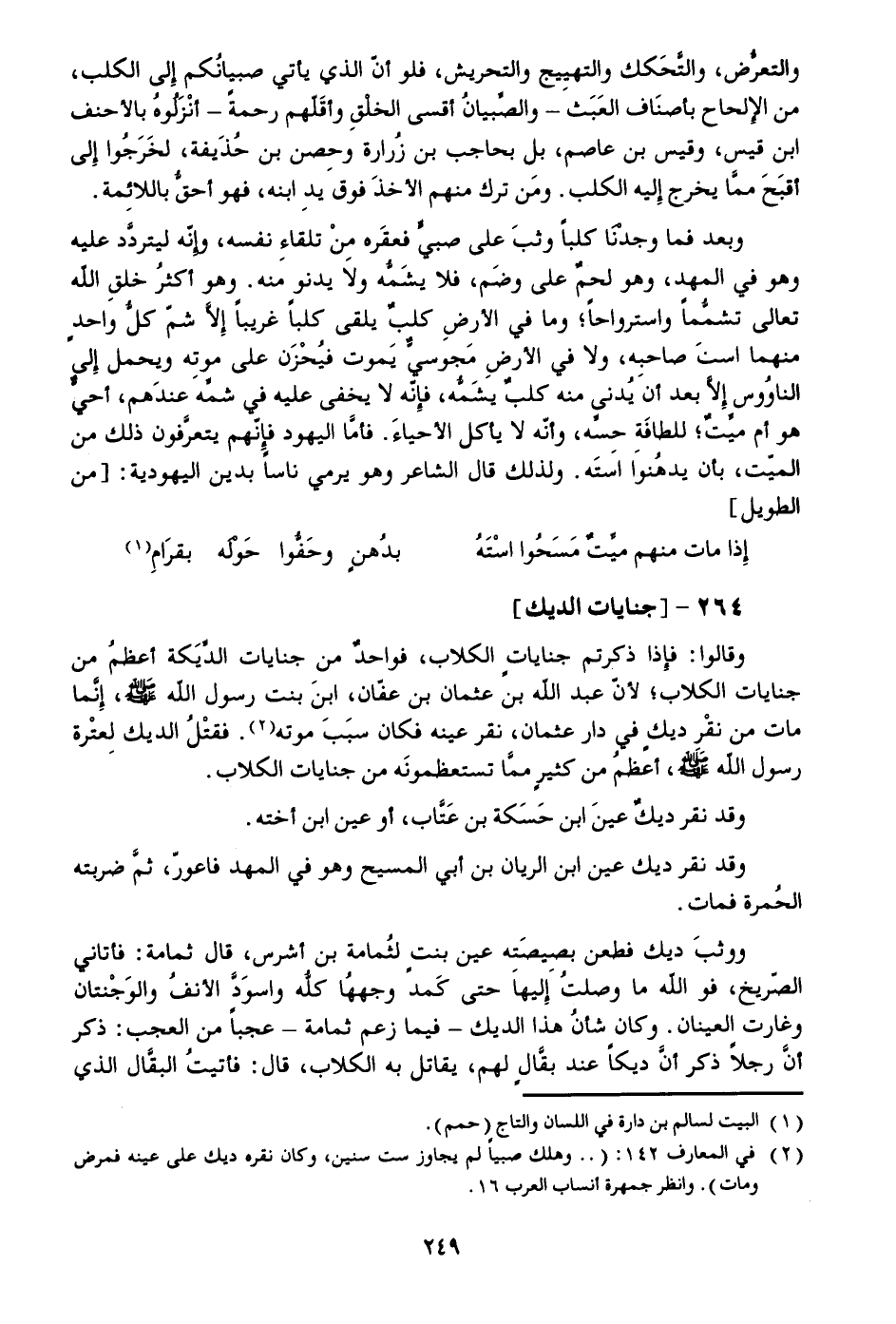 وقالوا: فإذا ذكرتم جنايات الكلاب، فواحد من جنايات الدّيكة أعظم من جنايات الكلاب؛ لأنّ عبد الله بن عثمان بن عفّان، ابن بنت رسول الله صلى الله عليه وسلم، إنّما مات من نقر ديك في دار عثمان، نقر عينه فكان سبب موته «2» . فقتل الديك لعترة رسول الله صلى الله عليه وسلم، أعظم من كثير ممّا تستعظمونه من جنايات الكلاب.