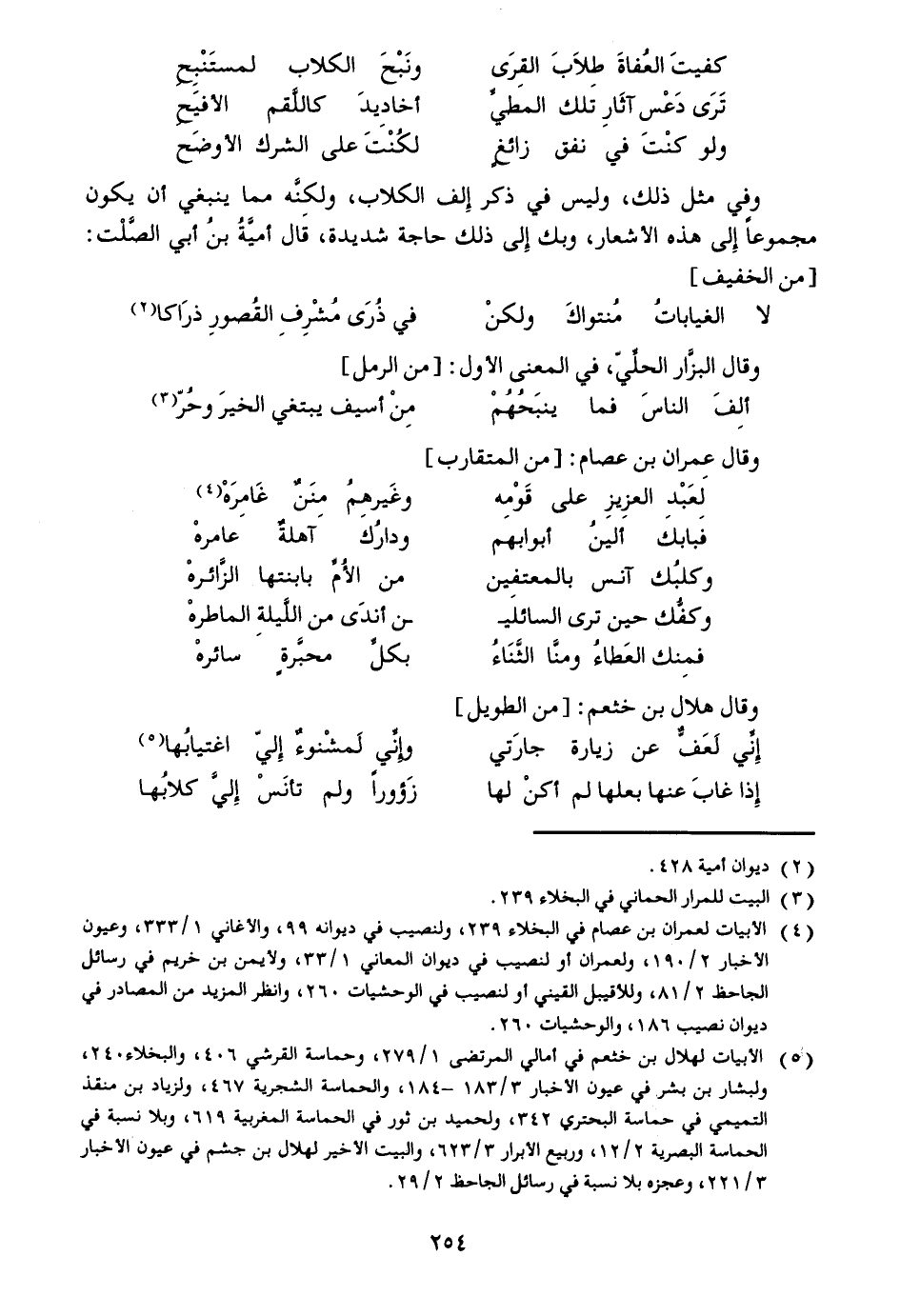 وفي مثل ذلك، وليس في ذكر إلف الكلاب، ولكنّه مما ينبغي أن يكون مجموعا إلى هذه الأشعار، وبك إلى ذلك حاجة شديدة، قال أميّة بن أبي الصّلت: