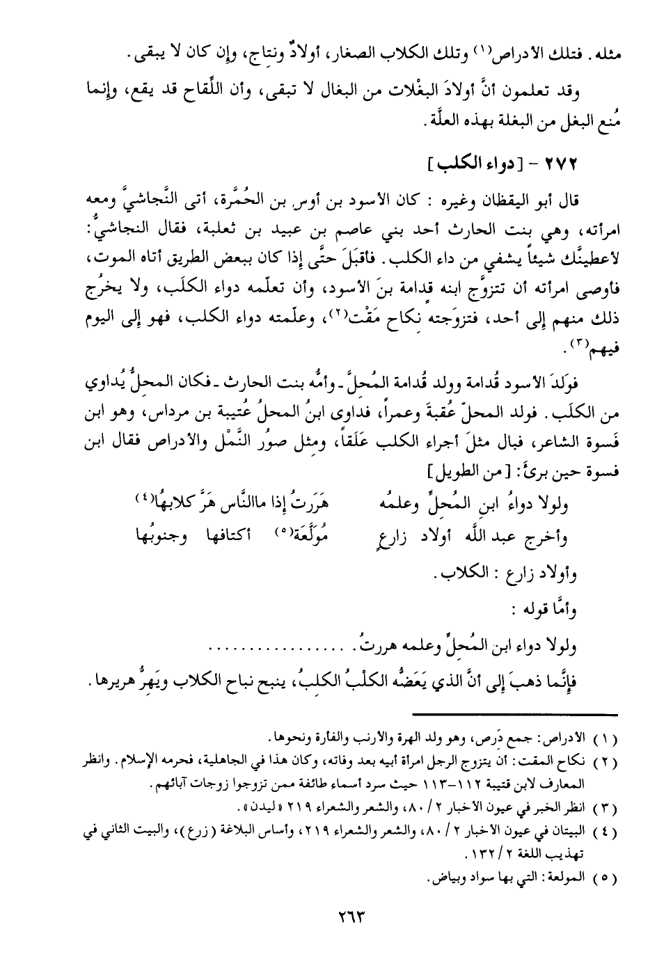 لأعطينّك شيئا يشفي من داء الكلب. فأقبل حتّى إذا كان ببعض الطريق أتاه الموت، فأوصى امرأته أن تتزوّج ابنه قدامة بن الأسود، وأن تعلّمه دواء الكلب، ولا يخرج ذلك منهم إلى أحد، فتزوجته نكاح مقت «2» ، وعلّمته دواء الكلب، فهو إلى اليوم فيهم «3» .