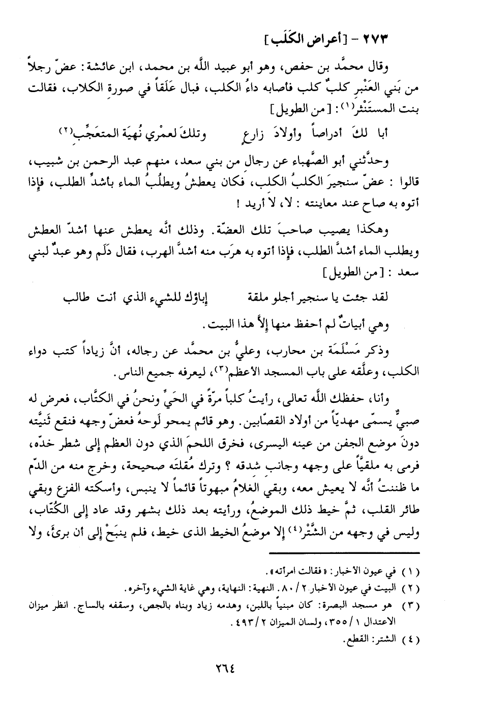 وأنا، حفظك الله تعالى، رأيت كلبا مرّة في الحيّ ونحن في الكتّاب، فعرض له صبيّ يسمّى مهديّا من أولاد القصّابين. وهو قائم يمحو لوحه فعضّ وجهه فنقع ثنيّته دون موضع الجفن من عينه اليسرى، فخرق اللحم الذي دون العظم إلى شطر خدّه، فرمى به ملقيّا على وجهه وجانب شدقه؟ وترك مقلته صحيحة، وخرج منه من الدّم ما ظننت أنّه لا يعيش معه، وبقي الغلام مبهوتا قائما لا ينبس، وأسكته الفزع وبقي طائر القلب، ثمّ خيط ذلك الموضع، ورأيته بعد ذلك بشهر وقد عاد إلى الكتّاب، وليس في وجهه من الشّتر «4» إلا موضع الخيط الذى خيط، فلم ينبح إلى أن برئ، ولا