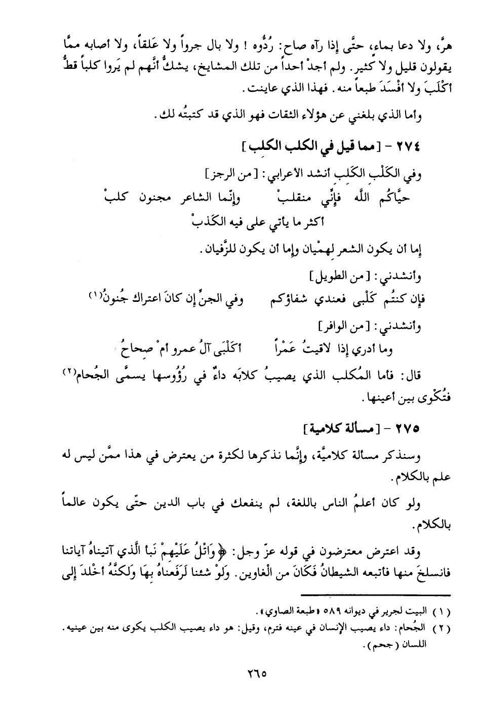 هرّ، ولا دعا بماء، حتّى إذا رآه صاح: ردّوه! ولا بال جروا ولا علقا، ولا أصابه ممّا يقولون قليل ولا كثير. ولم أجد أحدا من تلك المشايخ، يشكّ أنّهم لم يروا كلبا قطّ أكلب ولا أفسد طبعا منه. فهذا الذي عاينت.