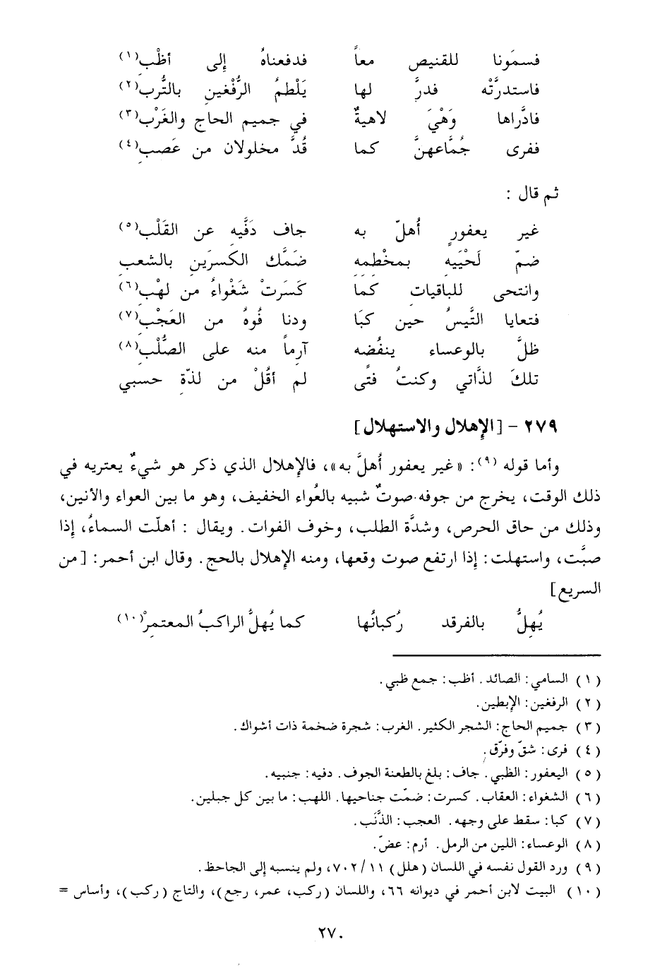 وأما قوله «9» : «غير يعفور أهلّ به» ، فالإهلال الذي ذكر هو شيء يعتريه في ذلك الوقت، يخرج من جوفه صوت شبيه بالعواء الخفيف، وهو ما بين العواء والأنين، وذلك من حاق الحرص، وشدّة الطلب، وخوف الفوات. ويقال: أهلّت السماء، إذا صبّت، واستهلت: إذا ارتفع صوت وقعها، ومنه الإهلال بالحج. وقال ابن أحمر: [من السريع]