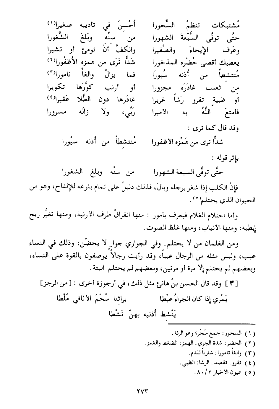 ومن الغلمان من لا يحتلم. وفي الجواري جوار لا يحضن، وذلك في النساء عيب، وليس مثله من الرجال عيبا، وقد رأيت رجالا يوصفون بالقوة على النساء، وبعضهم لم يحتلم إلا مرة أو مرتين، وبعضهم لم يحتلم البتة.