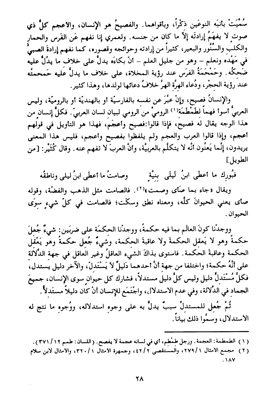 سمّيت بأنبه النوعين ذكرا، وبأقواهما. والفصيح هو الإنسان، والأعجم كلّ ذي صوت لايفهم إرادته إلّا ما كان من جنسه. ولعمري إنا نفهم عن الفرس والحمار والكلب والسّنّور والبعير، كثيرا من إرادته وحوائجه وقصوره، كما نفهم إرادة الصبيّ في مهده ونعلم- وهو من جليل العلم- أنّ بكاءه يدلّ على خلاف ما يدلّ عليه ضحكه. وحمحمة الفرس عند رؤية المخلاة، على خلاف ما يدلّ عليه حمحمته عند رؤية الحجر، ودعاء الهرّة الهرّ خلاف دعائها لولدها، وهذا كثير.