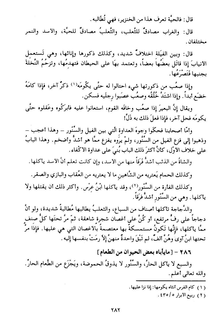 ويقال إنّ البعير إذا صعب وخافه القوم، استعانوا عليه فأبر كوه وعقلوه حتّى يكومه فحل آخر، فإذا فعل ذلك به ذلّ! وأمّا أصحابنا فحكوا وجوه العداوة الّتي بين الفيل والسّنّور- وهذا أعجب- وذهبوا إلى فزع الفيل من السّنّور، ولم يروه يفزع ممّا هو أشدّ وأضخم. وهذا الباب على خلاف الأوّل، كأنّ أكثر ذلك الباب بني على عداوة الأكفاء.