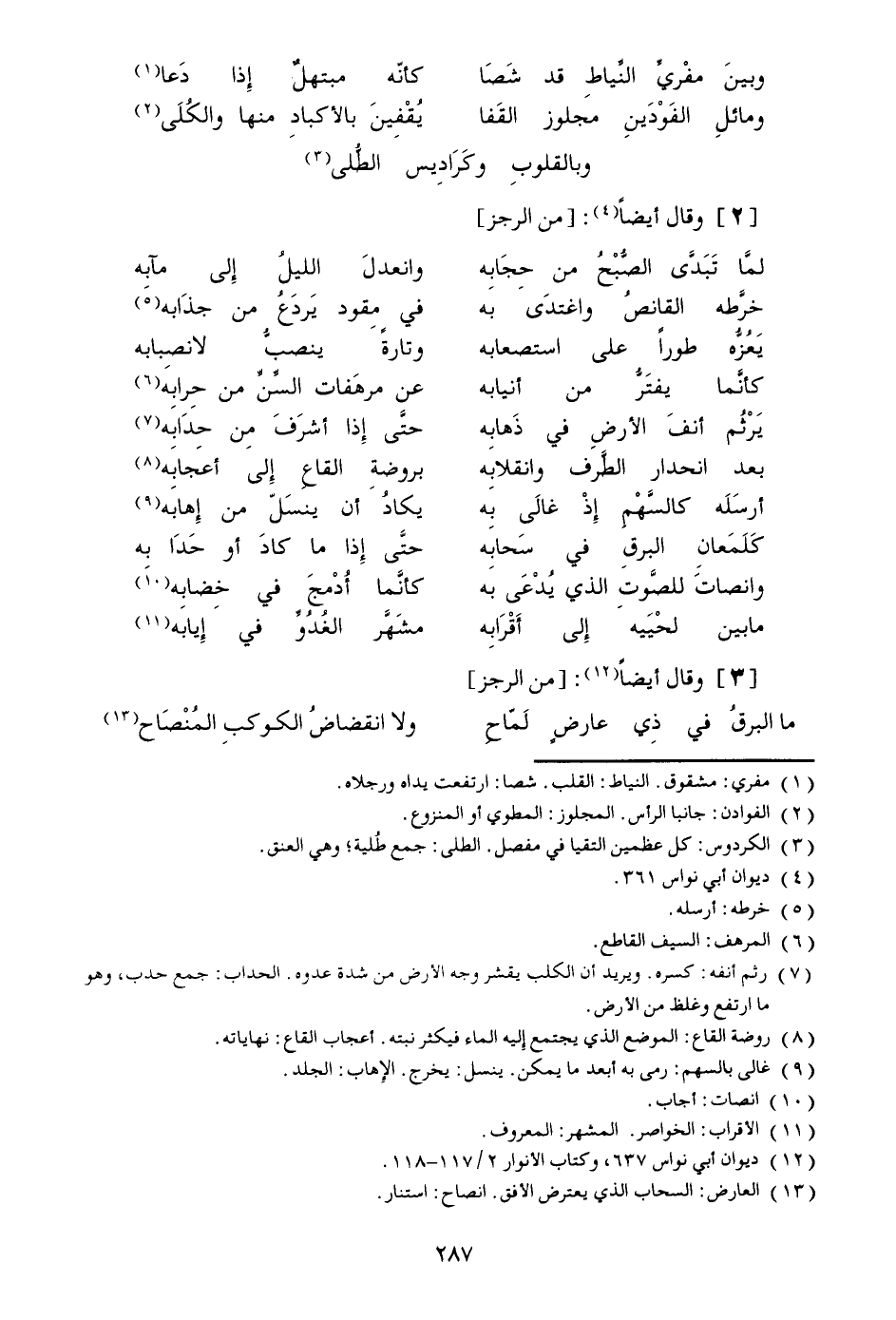 ما البرق في ذي عارض لمّاح ... ولا انقضاض الكوكب المنصاح «13»