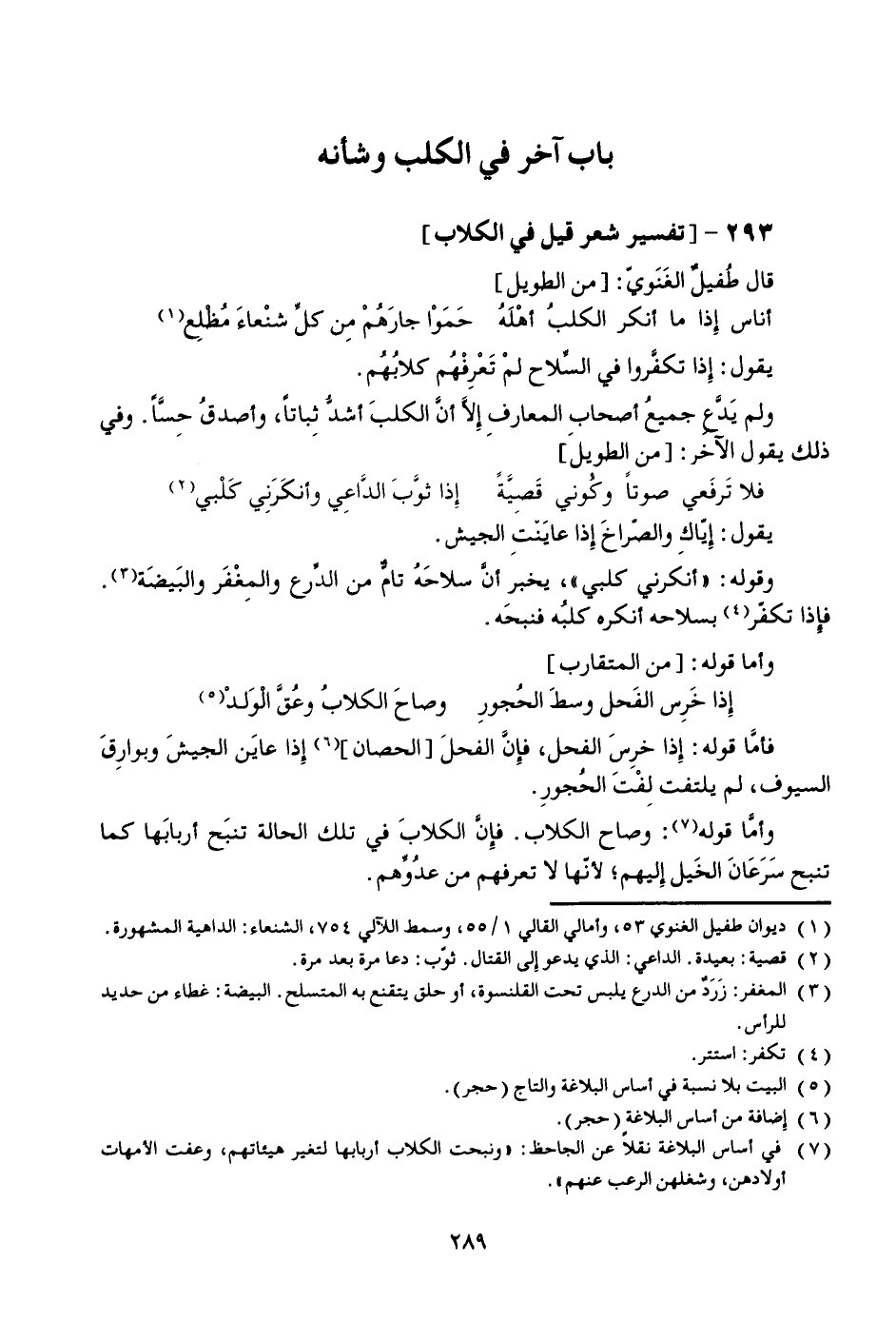 وأمّا قوله «7» : وصاح الكلاب. فإنّ الكلاب في تلك الحالة تنبح أربابها كما تنبح سرعان الخيل إليهم؛ لأنّها لا تعرفهم من عدوّهم.