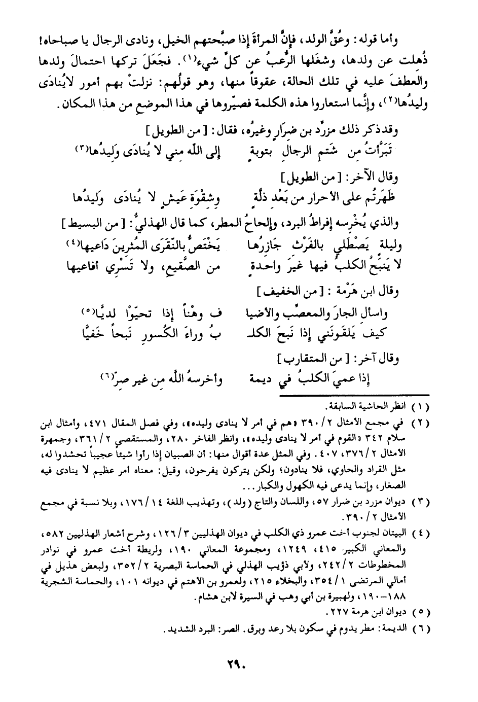وأما قوله: وعقّ الولد، فإنّ المرأة إذا صبّحتهم الخيل، ونادى الرجال يا صباحاه! ذهلت عن ولدها، وشغلها الرّعب عن كلّ شيء «1» . فجعل تركها احتمال ولدها والعطف عليه في تلك الحالة، عقوقا منها، وهو قولهم: نزلت بهم أمور لا ينادى وليدها «2» ، وإنّما استعاروا هذه الكلمة فصيّروها في هذا الموضع من هذا المكان.