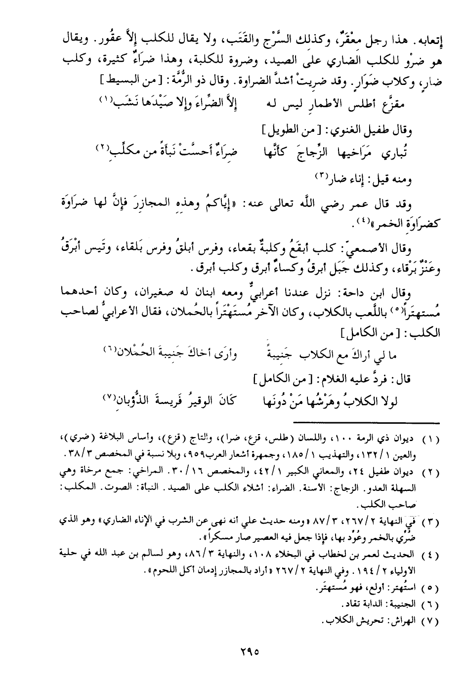 إتعابه. هذا رجل معقر، وكذلك السّرج والقتب، ولا يقال للكلب إلّا عقور. ويقال هو ضرو للكلب الضاري على الصيد، وضروة للكلبة، وهذا ضراء كثيرة، وكلب ضار، وكلاب ضوار. وقد ضريت أشدّ الضراوة. وقال ذو الرّمّة: [من البسيط]
