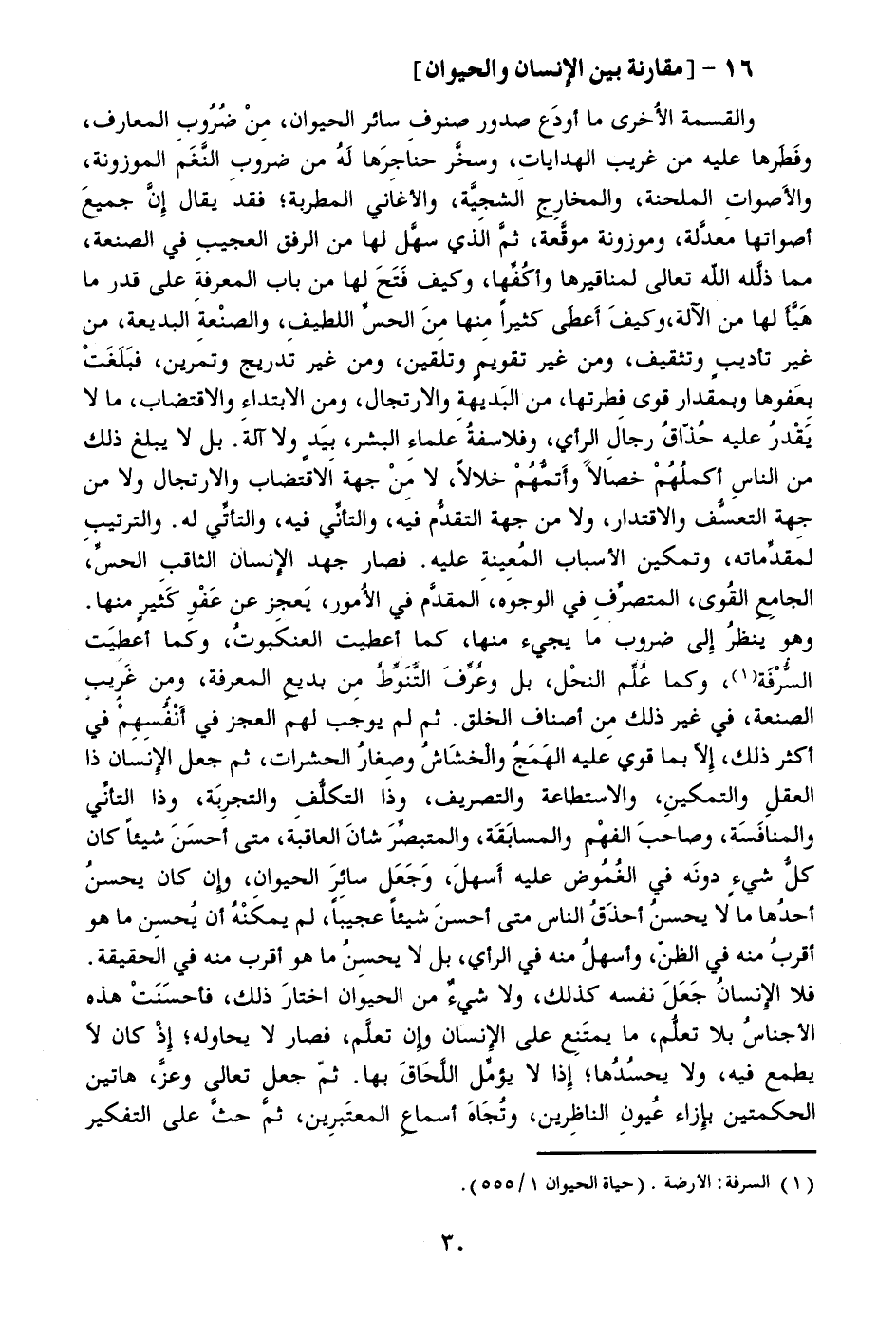 فلا الإنسان جعل نفسه كذلك، ولا شيء من الحيوان اختار ذلك، فأحسنت هذه الأجناس بلا تعلّم، ما يمتنع على الإنسان وإن تعلّم، فصار لا يحاوله؛ إذ كان لا يطمع فيه، ولا يحسدها؛ إذا لا يؤمّل اللّحاق بها. ثمّ جعل تعالى وعزّ، هاتين الحكمتين بإزاء عيون الناظرين، وتجاه أسماع المعتبرين، ثمّ حثّ على التفكير