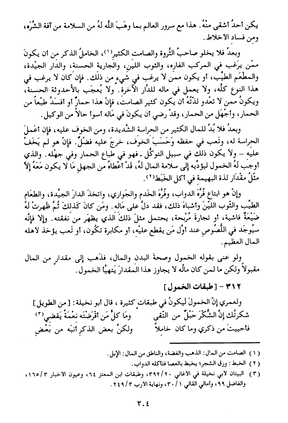 وبعد فلا يخلو صاحب الثّروة والصامت الكثير «1» ، الخامل الذكر من أن يكون ممّن يرغب في المركب الفاره، والثوب اللين، والجارية الحسنة، والدار الجيّدة، والمطعم الطيّب، أو يكون ممن لا يرغب في شيء من ذلك. فإن كان لا يرغب في هذا النوع كلّه، ولا يعمل في ماله للدّار الآخرة. ولا يعجب بالأحدوثة الحسنة، ويكون ممن لا تعدو لذّته أن يكون كثير الصامت، فإنّ هذا حمار أو أفسد طبعا من الحمار، وأجهل من الحمار، وقد رضي أن يكون في ماله أسوأ حالا من الوكيل.