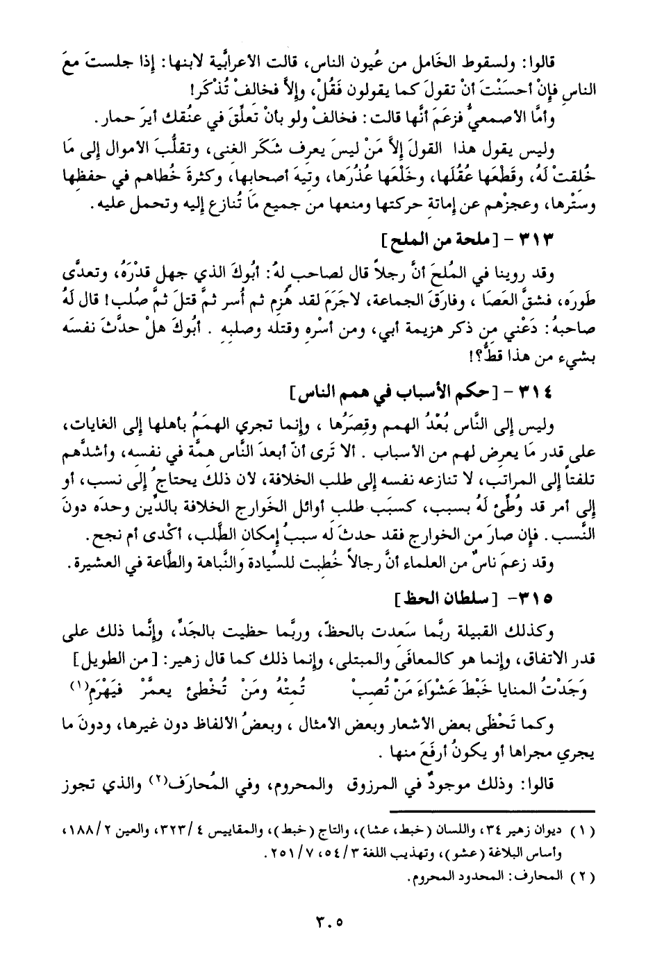 وليس إلى النّاس بعد الهمم وقصرها، وإنما تجري الهمم بأهلها إلى الغايات، على قدر ما يعرض لهم من الأسباب. ألا ترى أنّ أبعد النّاس همّة في نفسه، وأشدّهم تلفتا إلى المراتب، لا تنازعه نفسه إلى طلب الخلافة، لأن ذلك يحتاج إلى نسب، أو إلى أمر قد وطّئ له بسبب، كسبب طلب أوائل الخوارج الخلافة بالدّين وحده دون النّسب. فإن صار من الخوارج فقد حدث له سبب إمكان الطّلب، أكدى أم نجح.