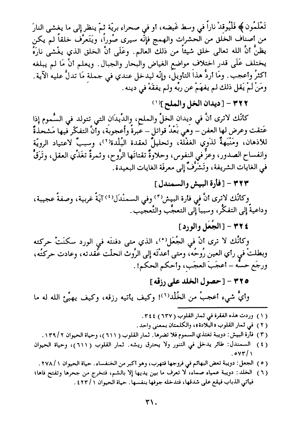 كأنّك لا ترى أنّ في ديدان الخلّ والملح، والدّيدان التي تتولد في السّموم إذا عتقت وعرض لها العفن- وهي بعد قواتل- عبرة وأعجوبة، وأنّ التفكّر فيها مشحذة للأذهان، ومنبهة لذوي الغفلة، وتحليل لعقدة البلدة»