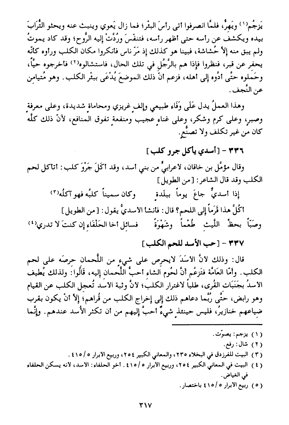 وقال مؤمّل بن خاقان، لأعرابيّ من بني أسد، وقد أكل جرو كلب: أتاكل لحم الكلب وقد قال الشاعر: [من الطويل]