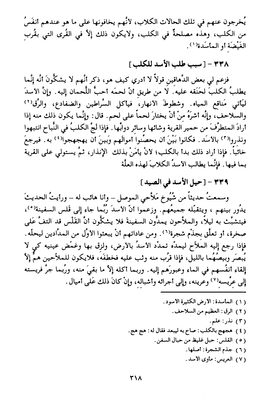 وسمعت حديثا من شيوخ ملّاحي الموصل- وأنا هائب له- ورأيت الحديث يدور بينهم، ويتقبّله جميعهم. وزعموا أنّ الأسد ربّما جاء إلى قلس السفينة «5» ، فيتشبّث به ليلا، والملّاحون يمدّون السفينة فلا يشكّون أنّ القلس قد التفّ على صخرة، أو تعلّق بجذم شجرة «6» . ومن عاداتهم أن يبعثوا الأوّل من المدّادين ليحلّه.