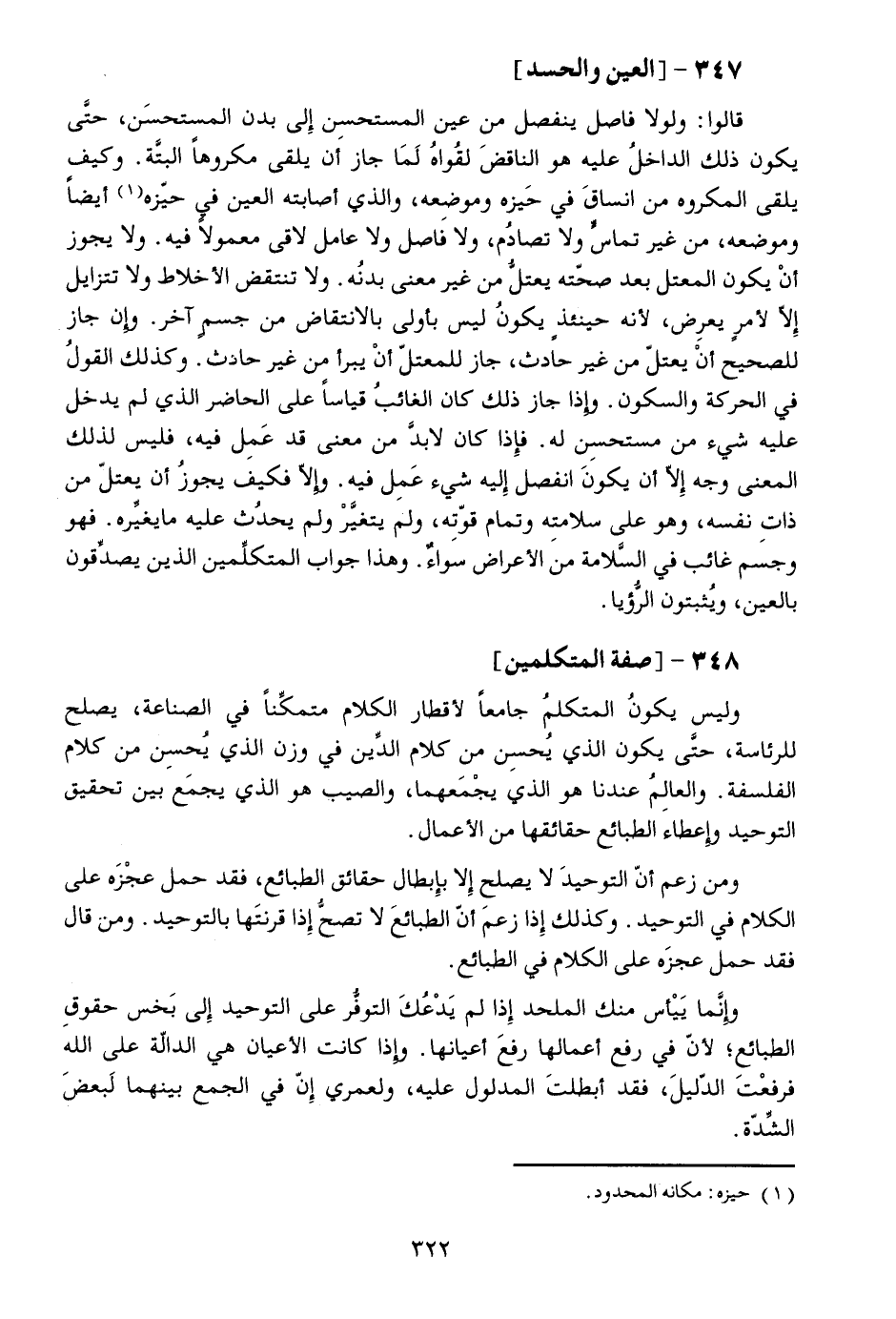 ومن زعم أنّ التوحيد لا يصلح إلا بإبطال حقائق الطبائع، فقد حمل عجزه على الكلام في التوحيد. وكذلك إذا زعم أنّ الطبائع لا تصحّ إذا قرنتها بالتوحيد. ومن قال فقد حمل عجزه على الكلام في الطبائع.