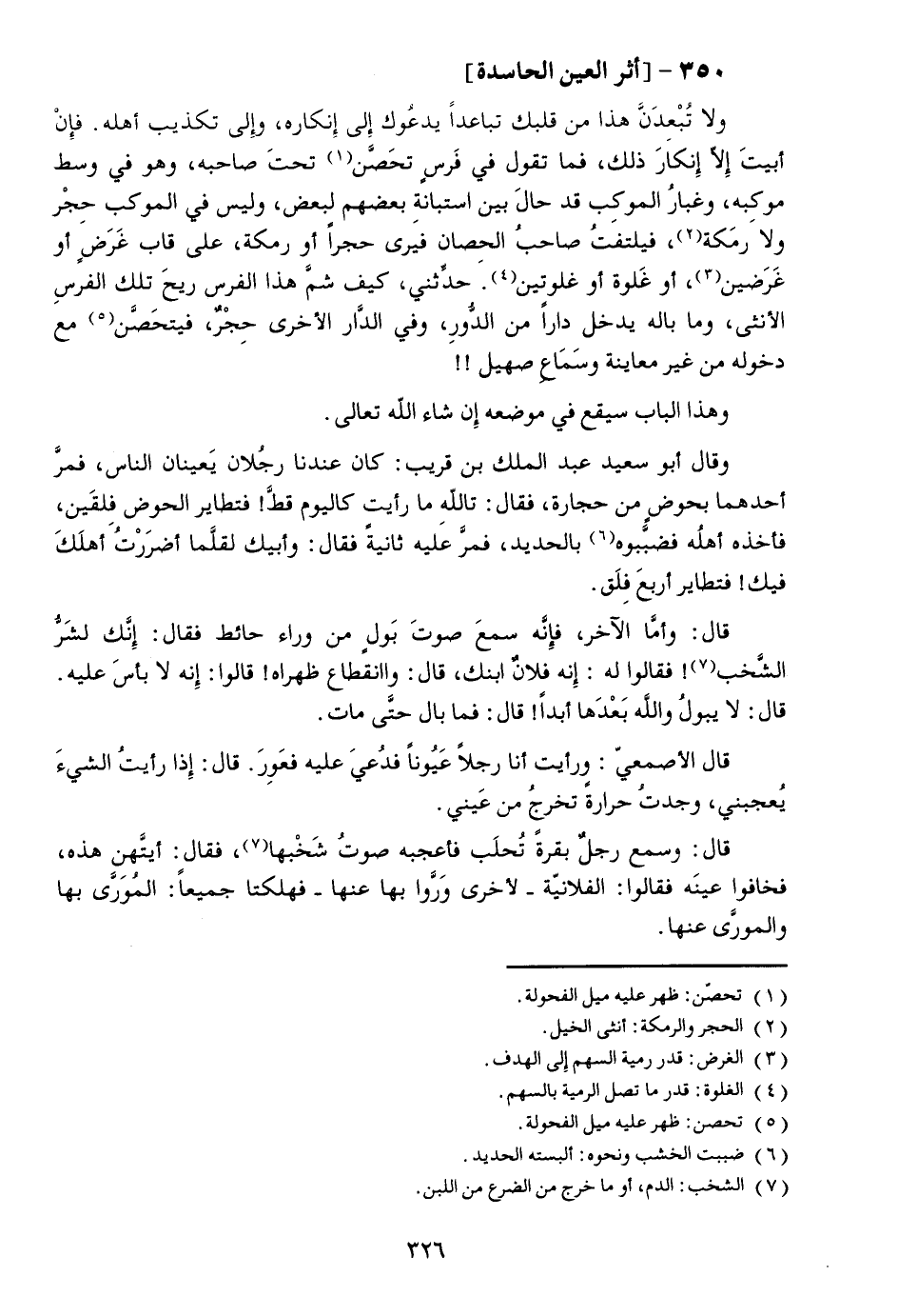 ولا تبعدنّ هذا من قلبك تباعدا يدعوك إلى إنكاره، وإلى تكذيب أهله. فإن أبيت إلّا إنكار ذلك، فما تقول في فرس تحصّن «1» تحت صاحبه، وهو في وسط موكبه، وغبار الموكب قد حال بين استبانة بعضهم لبعض، وليس في الموكب حجر ولا رمكة «2» ، فيلتفت صاحب الحصان فيرى حجرا أو رمكة، على قاب غرض أو غرضين «3» ، أو غلوة أو غلوتين «4» . حدّثني، كيف شمّ هذا الفرس ريح تلك الفرس الأنثى، وما باله يدخل دارا من الدّور، وفي الدّار الأخرى حجر، فيتحصّن «5» مع دخوله من غير معاينة وسماع صهيل!! وهذا الباب سيقع في موضعه إن شاء الله تعالى.