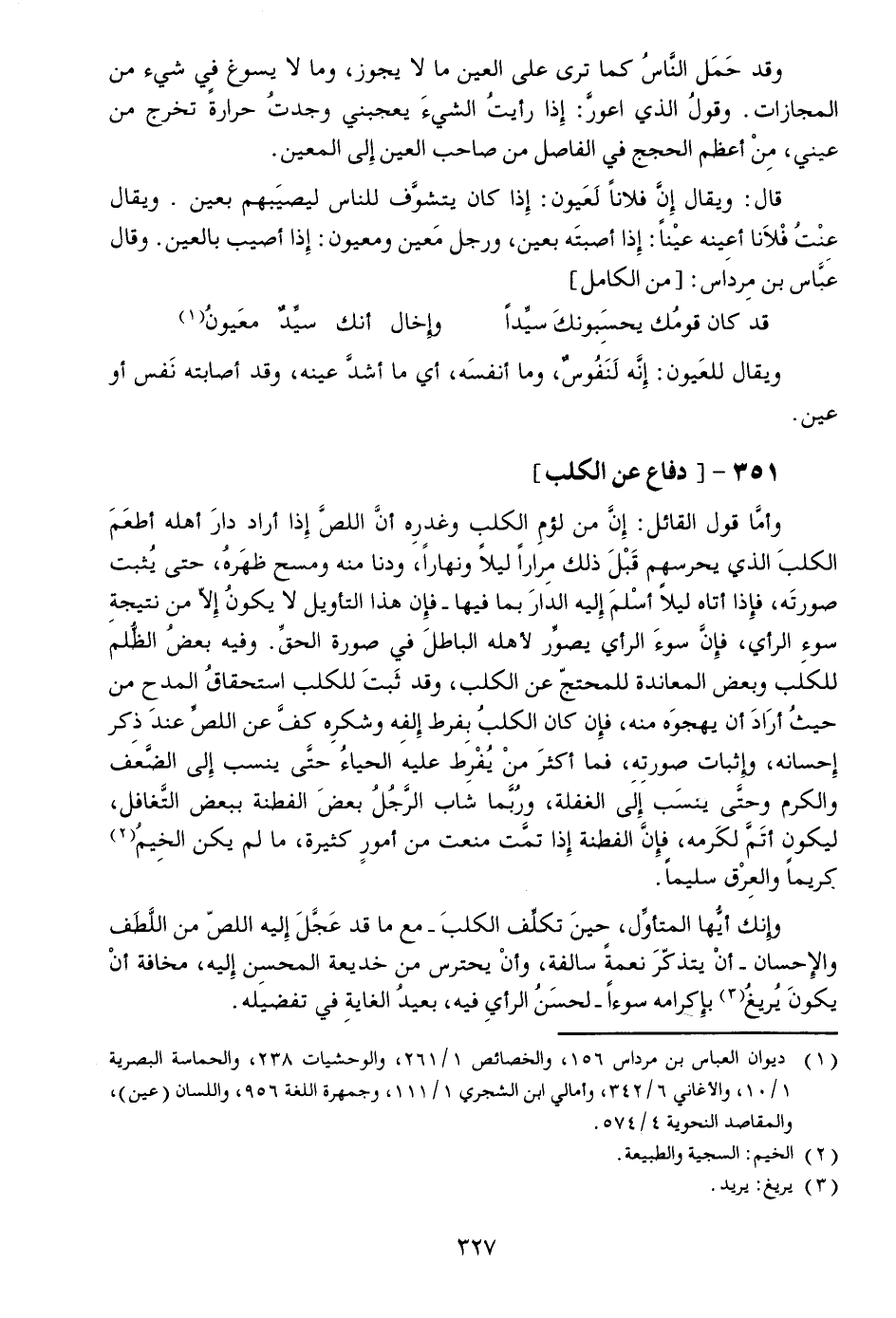 وقد حمل النّاس كما ترى على العين ما لا يجوز، وما لا يسوغ في شيء من المجازات. وقول الذي اعورّ: إذا رأيت الشيء يعجبني وجدت حرارة تخرج من عيني، من أعظم الحجج في الفاصل من صاحب العين إلى المعين.