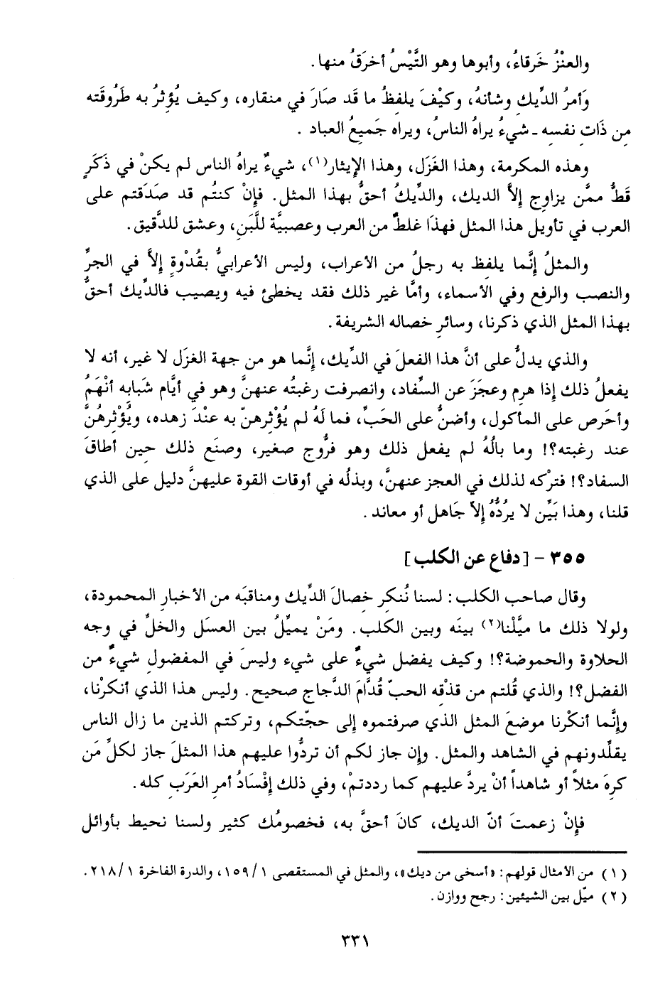 والمثل إنّما يلفظ به رجل من الأعراب، وليس الأعرابيّ بقدوة إلّا في الجر والنصب والرفع وفي الأسماء، وأمّا غير ذلك فقد يخطئ فيه ويصيب فالدّيك أحقّ بهذا المثل الذي ذكرنا، وسائر خصاله الشريفة.