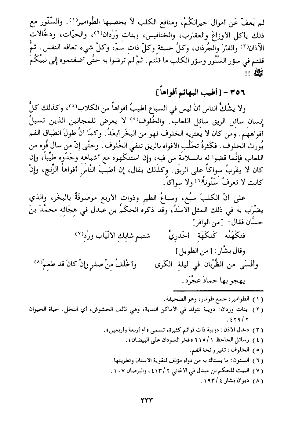 على أنّ الكلب سبع، وسباع الطير وذوات الأربع موصوفة بالبخر، والذي يضرب به في ذلك المثل الأسد، وقد ذكره الحكم بن عبدل في هجائه محمّد بن حسّان فقال: [من الوافر]