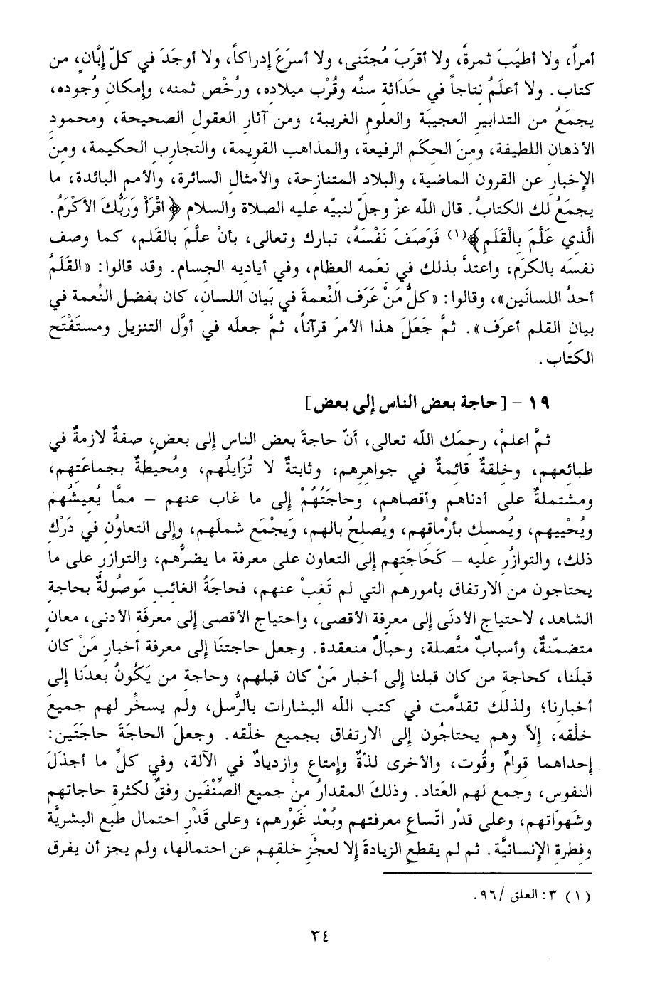 ثمّ اعلم، رحمك الله تعالى، أنّ حاجة بعض الناس إلى بعض، صفة لازمة في طبائعهم، وخلقة قائمة في جواهرهم، وثابتة لا تزايلهم، ومحيطة بجماعتهم، ومشتملة على أدناهم وأقصاهم، وحاجتهم إلى ما غاب عنهم- ممّا يعيشهم ويحييهم، ويمسك بأرماقهم، ويصلح بالهم، ويجمع شملهم، وإلى التعاون في درك ذلك، والتوازر عليه- كحاجتهم إلى التعاون على معرفة ما يضرّهم، والتوازر على ما يحتاجون من الارتفاق بأمورهم التي لم تغب عنهم، فحاجة الغائب موصولة بحاجة الشاهد، لاحتياج الأدنى إلى معرفة الأقصى، واحتياج الأقصى إلى معرفة الأدنى، معان متضمّنة، وأسباب متّصلة، وحبال منعقدة. وجعل حاجتنا إلى معرفة أخبار من كان قبلنا، كحاجة من كان قبلنا إلى أخبار من كان قبلهم، وحاجة من يكون بعدنا إلى أخبارنا؛ ولذلك تقدّمت في كتب الله البشارات بالرّسل، ولم يسخّر لهم جميع خلقه، إلّا وهم يحتاجون إلى الارتفاق بجميع خلقه. وجعل الحاجة حاجتين: