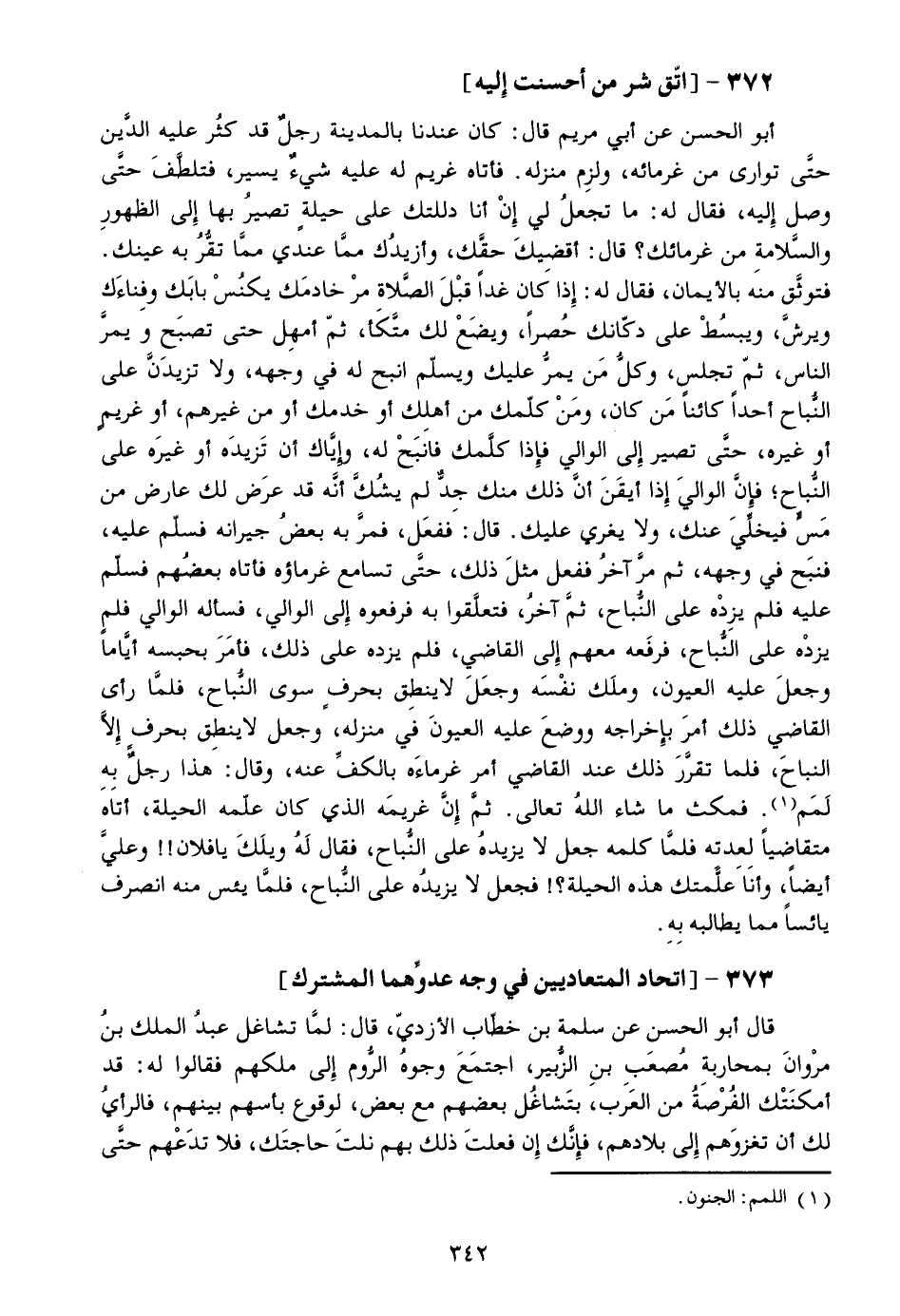 أبو الحسن عن أبي مريم قال: كان عندنا بالمدينة رجل قد كثر عليه الدّين حتّى توارى من غرمائه، ولزم منزله. فأتاه غريم له عليه شيء يسير، فتلطّف حتّى وصل إليه، فقال له: ما تجعل لي إن أنا دللتك على حيلة تصير بها إلى الظهور والسّلامة من غرمائك؟ قال: أقضيك حقّك، وأزيدك ممّا عندي ممّا تقرّ به عينك.