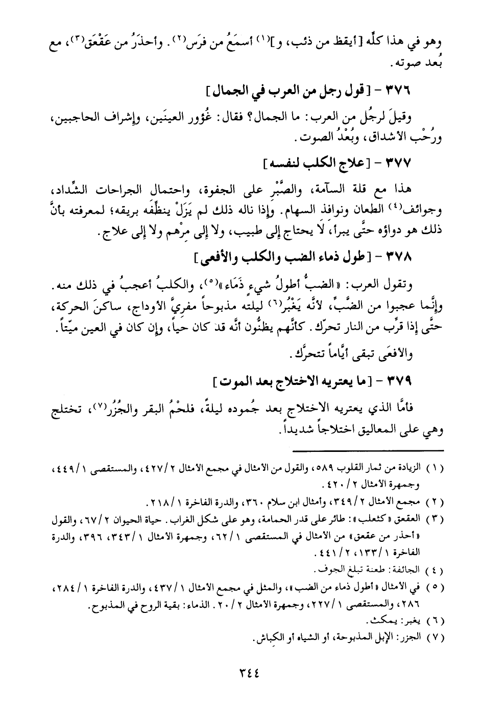 وتقول العرب: «الضبّ أطول شيء ذماء» «5» ، والكلب أعجب في ذلك منه.