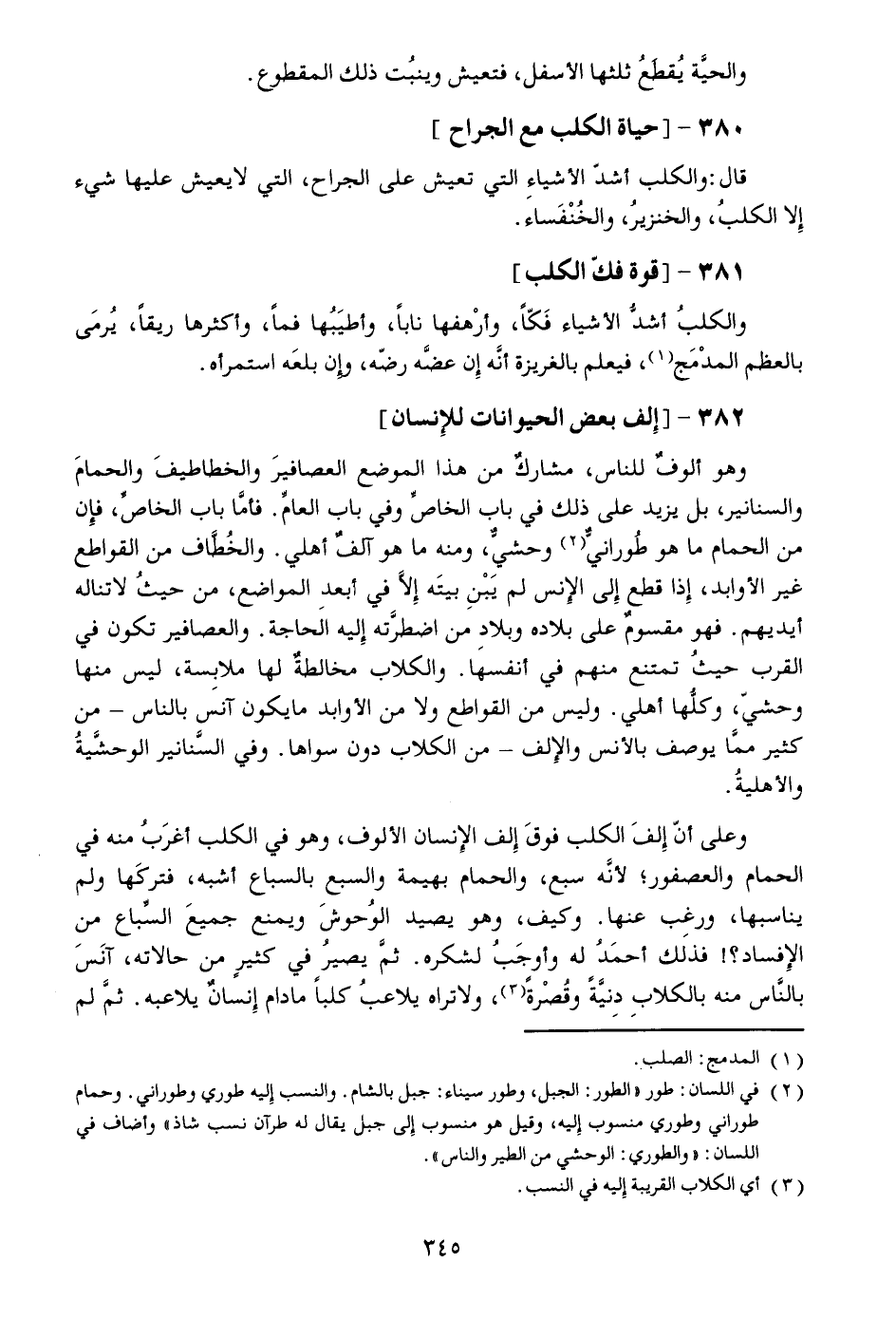 وعلى أنّ إلف الكلب فوق إلف الإنسان الألوف، وهو في الكلب أغرب منه في الحمام والعصفور؛ لأنّه سبع، والحمام بهيمة والسبع بالسباع أشبه، فتركها ولم يناسبها، ورغب عنها. وكيف، وهو يصيد الوحوش ويمنع جميع السّباع من الإفساد؟! فذلك أحمد له وأوجب لشكره. ثمّ يصير في كثير من حالاته، آنس بالنّاس منه بالكلاب دنيّة وقصرة «3» ، ولا تراه يلاعب كلبا مادام إنسان يلاعبه. ثمّ لم