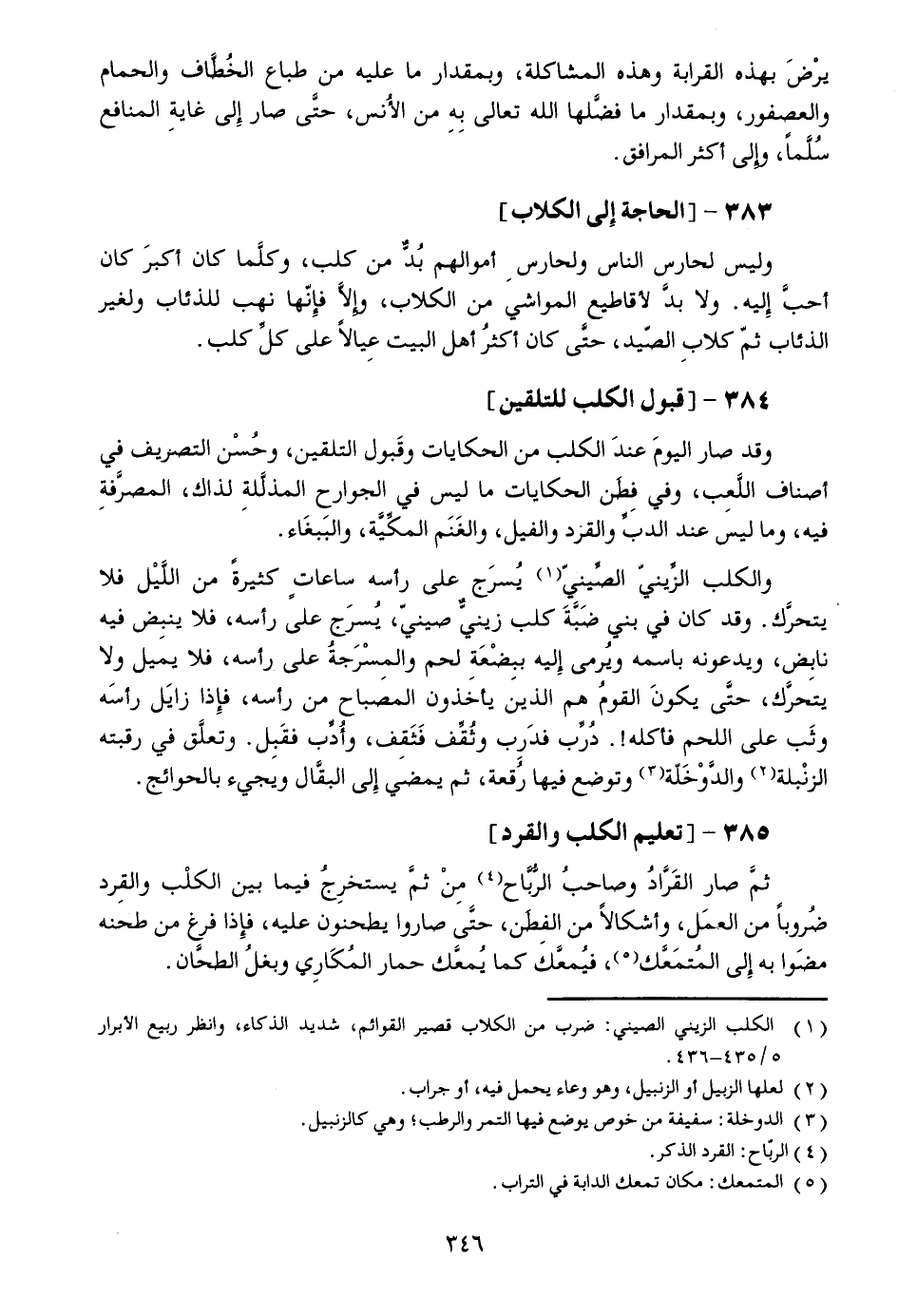 وليس لحارس الناس ولحارس أموالهم بدّ من كلب، وكلّما كان أكبر كان أحبّ إليه. ولا بدّ لأقاطيع المواشي من الكلاب، وإلّا فإنّها نهب للذئاب ولغير الذئاب ثمّ كلاب الصّيد، حتّى كان أكثر أهل البيت عيالا على كلّ كلب.