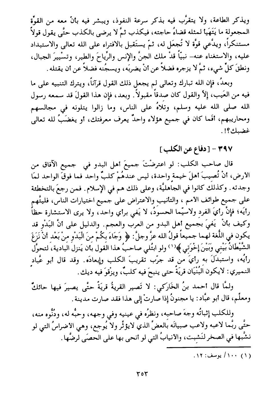 قال صاحب الكلب: لو اعترضت جميع أهل البدو في جميع الآفاق من الأرض، أن تصيب أهل خيمة واحدة، ليس عندهم كلب واحد فما فوق الواحد لما وجدته. وكذلك كانوا في الجاهليّة، وعلى ذلك هم في الإسلام. فمن رجع بالتخطئة على جميع طوائف الأمم، والتأنيب والاعتراض على جميع اختيارات الناس، فليتّهم رأيه؛ فإنّ رأي الفرد ولا سيّما الحسود، لا يفي برأي واحد، ولا يرى الاستشارة حظا وكيف بأن يفي بجميع أهل البدو من العرب والعجم. والدليل على أنّ البدو قد يكون في اللّغة لهما جميعا قول الله عزّ وجلّ: وَجاءَ بِكُمْ مِنَ الْبَدْوِ مِنْ بَعْدِ أَنْ نَزَغَ الشَّيْطانُ بَيْنِي وَبَيْنَ إِخْوَتِي