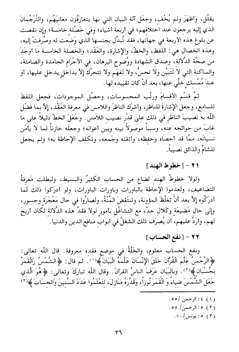 ولولا خطوط الهند لضاع من الحساب الكثير والبسيط، ولبطلت معرفة التضاعيف، ولعدموا الإحاطة بالباورات وباورات الباورات، ولو أدركوا ذلك لما أدركوه إلّا بعد أن تغلظ المؤونة، وتنتقض المنّة، ولصاروا في حال معجزة وحسور، وإلى حال مضيعة وكلال حدّ، مع التشاغل بأمور لولا فقد هذه الدّلالة لكان أربح لهم، وأردّ عليهم، أن يصرف ذلك الشغل في أبواب منافع الدين والدنيا.