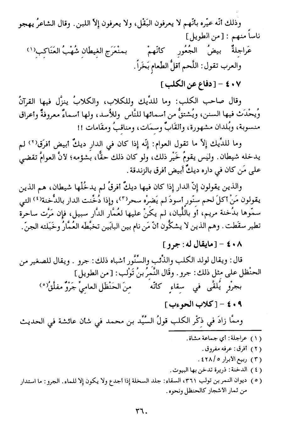 وقال صاحب الكلب: وما للدّيك وللكلاب، والكلاب ينزّل فيها القرآن ويحدث فيها السنن، ويشتقّ من أسمائها للنّاس وللأسد، ولها أسماء معروفة وأعراق منسوبة، وبلدان مشهورة، وألقاب وسمات، ومناقب ومقامات!! وما للدّيك إلّا ما تقول العوام: إنّه إذا كان في الدار ديك أبيض أفرق «2» لم يدخله شيطان. وليس يقوم خير ذلك، ولو كان ذلك حقّا، بشؤمه؛ لأنّ العوامّ تقضي على من كان في داره ديك أبيض أفرق بالزندقة.
