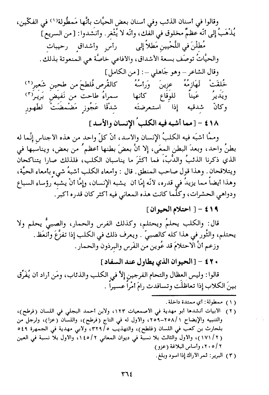 وممّا أشبه فيه الكلب الإنسان والأسد، أنّ كلّ واحد من هذه الأجناس إنّما له بطن واحد، وبعد البطن المعى، إلا أنّ بعض بطنها أعظم من بعض، ويناسبها في الذي ذكرنا الذئب والدّبّ، فما أكثر ما يناسبان الكلب، فلذلك صارا يتناكحان ويتلاقحان. وهذا قول صاحب المنطق. قال: وأمعاء الكلب أشبه شيء بأمعاء الحيّة، وهذا أيضا مما يزيد في قدره، لأنّه إمّا أن يشبه الإنسان، وإمّا أن يشبه رؤساء السباع ودواهي الحشرات، وكلّما كانت هذه المعاني فيه أكثر كان قدره أكبر.