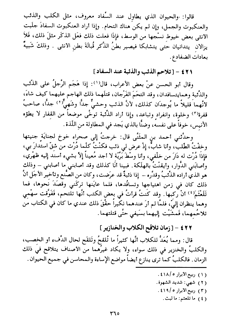 وحدّثني أحمد بن المثنّى قال: خرجت إلى صحراء خوخ لجناية جنيتها وخفت الطّلب، وأنا شابّ، إذ عرض لي ذئب فكنت كلّما درت من شقّ استدار بي، فإذا درت له دار من خلفي، وأنا وسط برّيّة لا أجد معينا إلّا بشيء أسند إليه ظهري، وأصابني الدّوار، وأيقنت بالهلكة. فبينا أنا كذلك وقد أصابني ما أصابني- وذلك هو الذي أراده الذّئب وقدّره- إذا ذئبة قد عرضت، وكان من الصّنع وتأخير الأجل أنّ ذلك كان في زمن اهتياجها وتسافدها، فلما عاينها تركني وقصد نحوها، فما تلعثم «4» أن ركبها. وقد كنت قرأت في بعض الكتب أنّها تلتحم، ففوّقت سهمي وهما ينظران إليّ، فلمّا لم أر عندهما نكيرا حقّق ذلك عندي ما كان في الكتاب من تلاحمهما، فمشيت إليهما بسيفي حتّى قتلتهما.