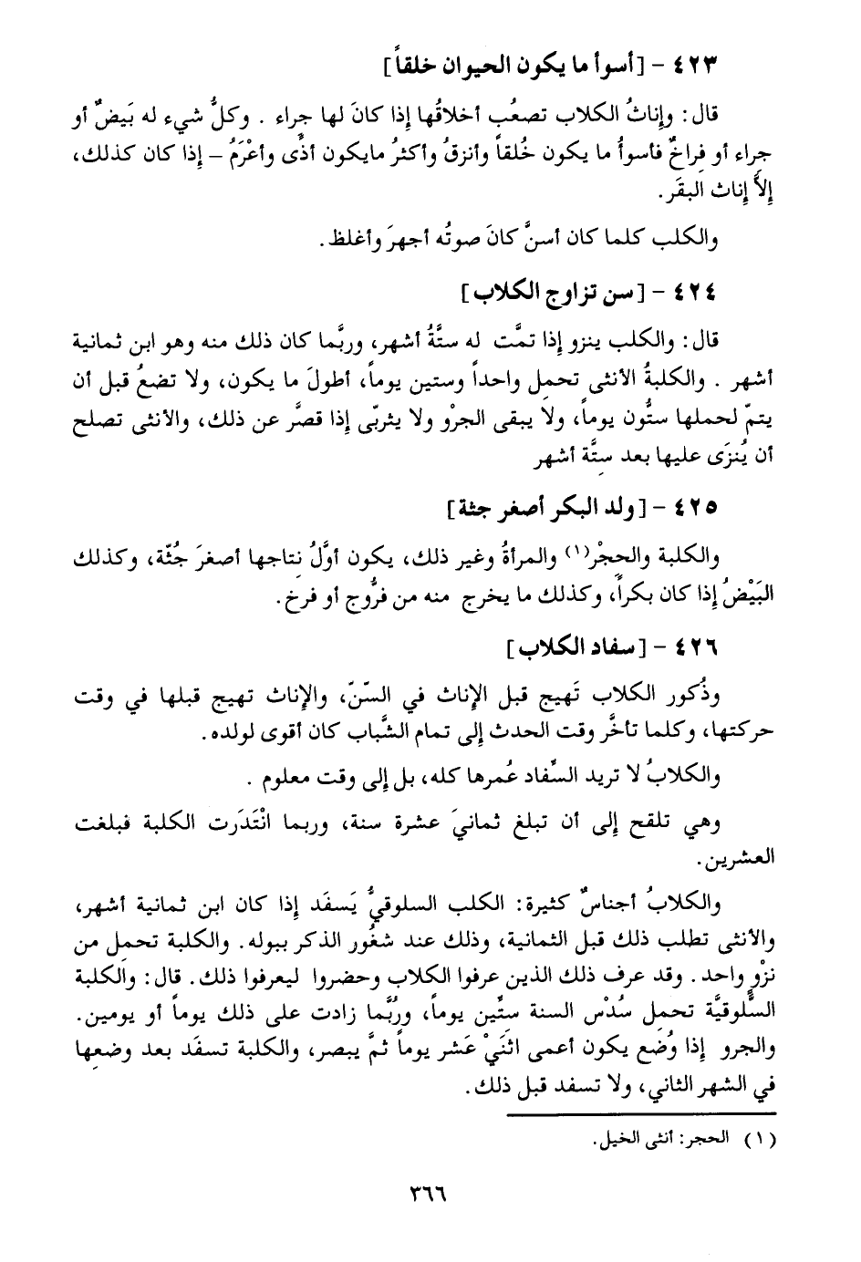 قال: وإناث الكلاب تصعب أخلاقها إذا كان لها جراء. وكلّ شيء له بيض أو جراء أو فراخ فأسوأ ما يكون خلقا وأنزق وأكثر ما يكون أذى وأعرم- إذا كان كذلك، إلّا إناث البقر.