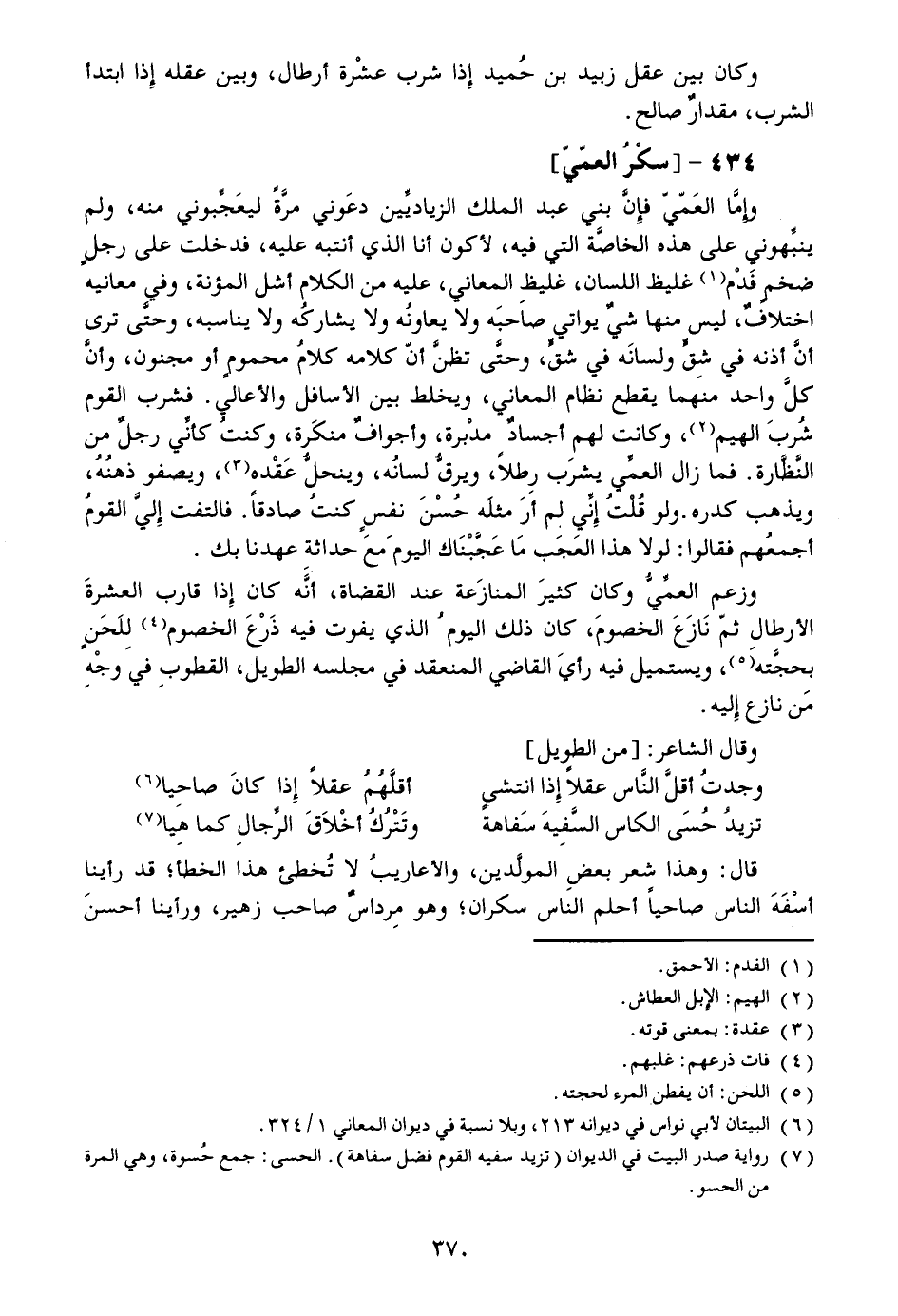 وزعم العمّيّ وكان كثير المنازعة عند القضاة، أنّه كان إذا قارب العشرة الأرطال ثمّ نازع الخصوم، كان ذلك اليوم الذي يفوت فيه ذرع الخصوم «4» للحن بحجّته «5» ، ويستميل فيه رأي القاضي المنعقد في مجلسه الطويل، القطوب في وجه من نازع إليه.